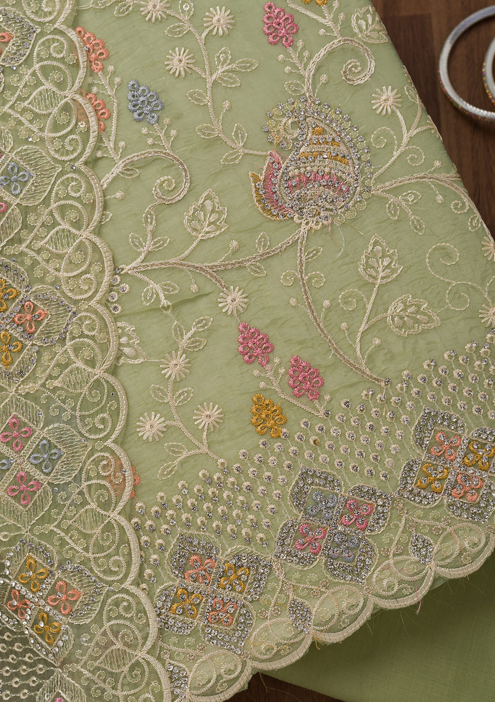 Leaf Green Zariwork Semi Crepe Unstitched Salwar Suit