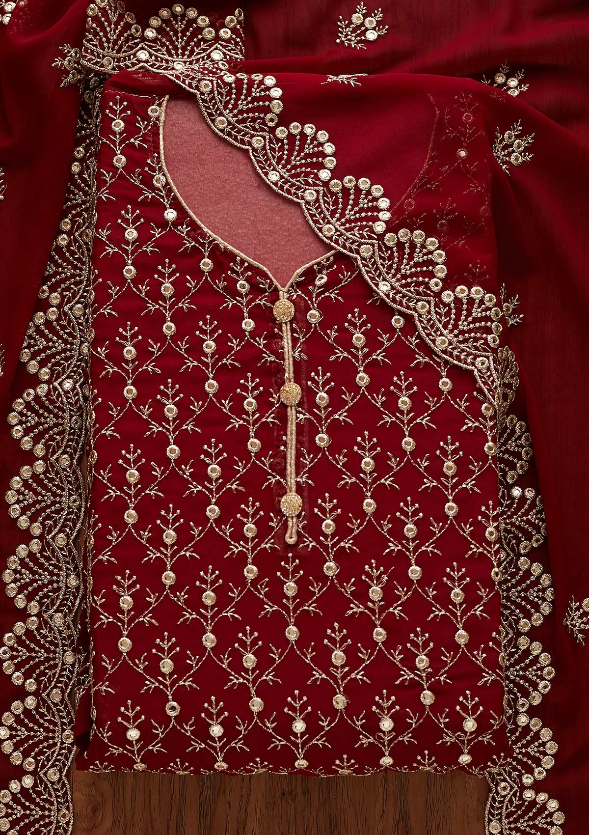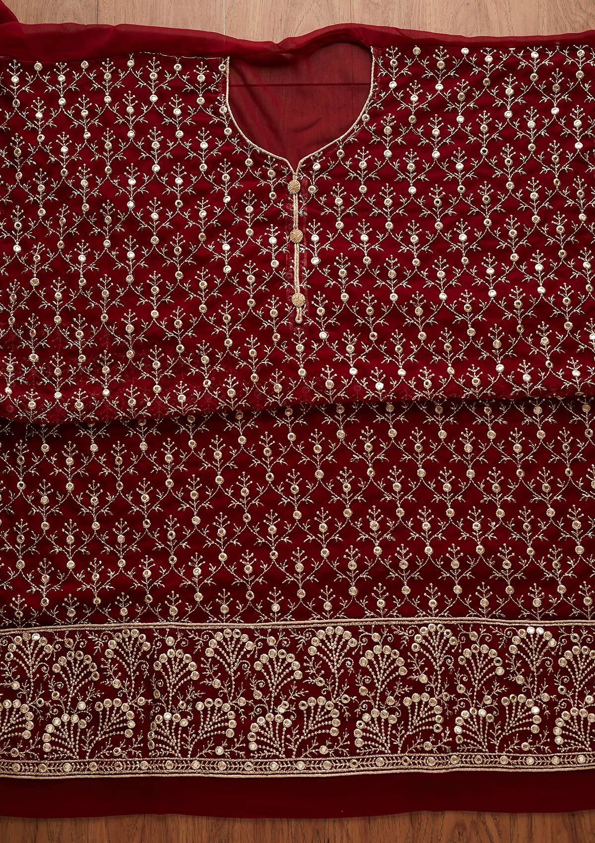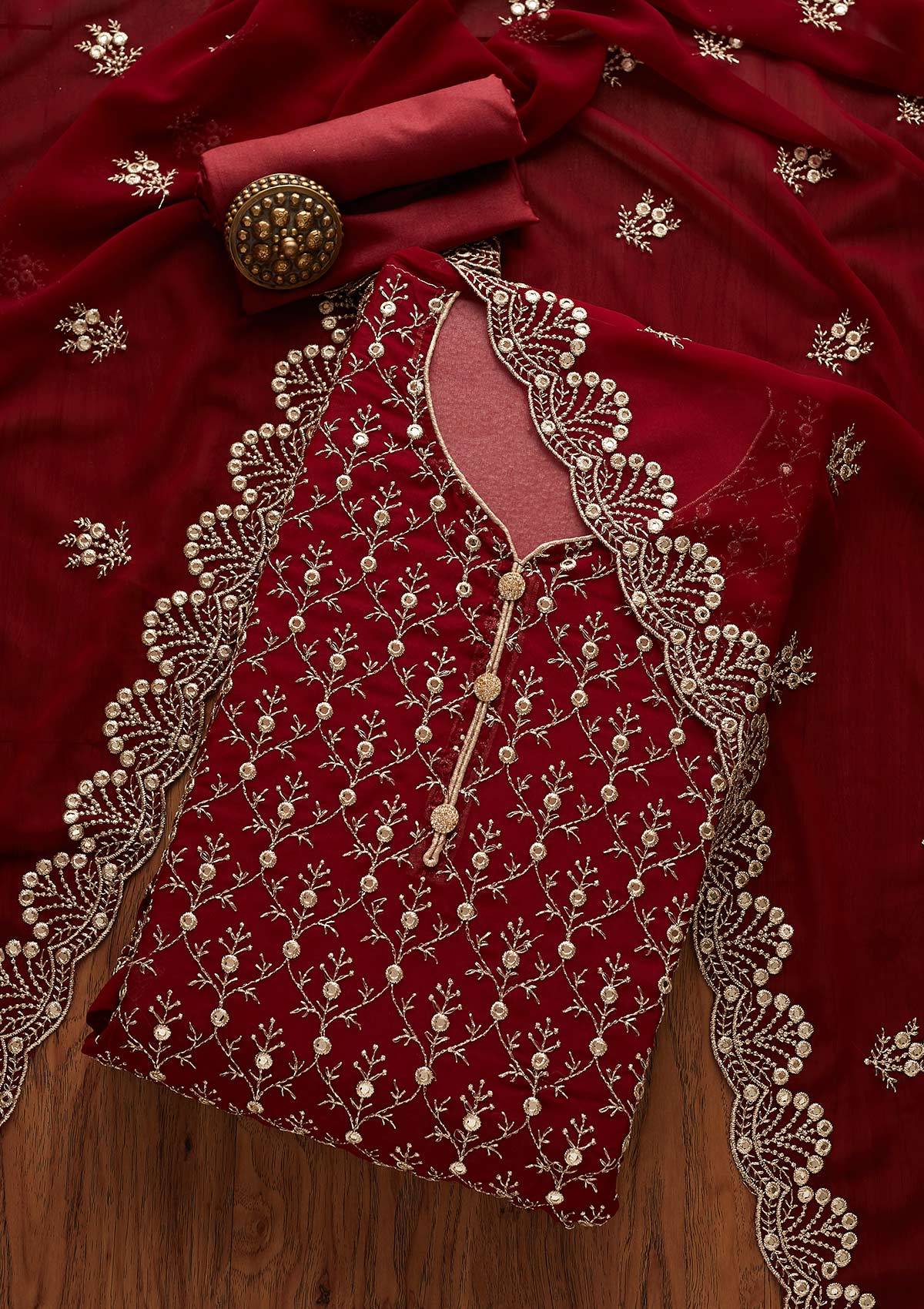 Maroon Unstitched Salwar Suit in georgette fabric. The unstitched salwar suit is elevated with swarovski embroidery. Accompanied with an unstitched botton and dupatta. Comes with the Koskii promise of premium quality.