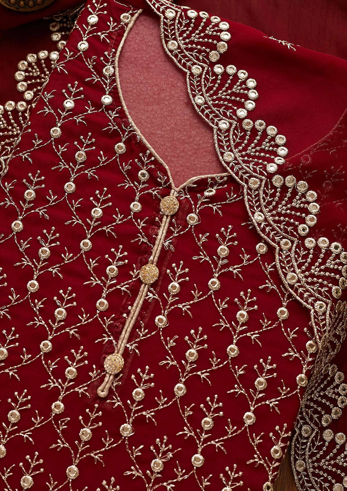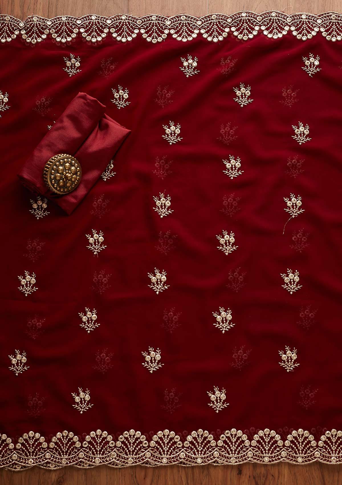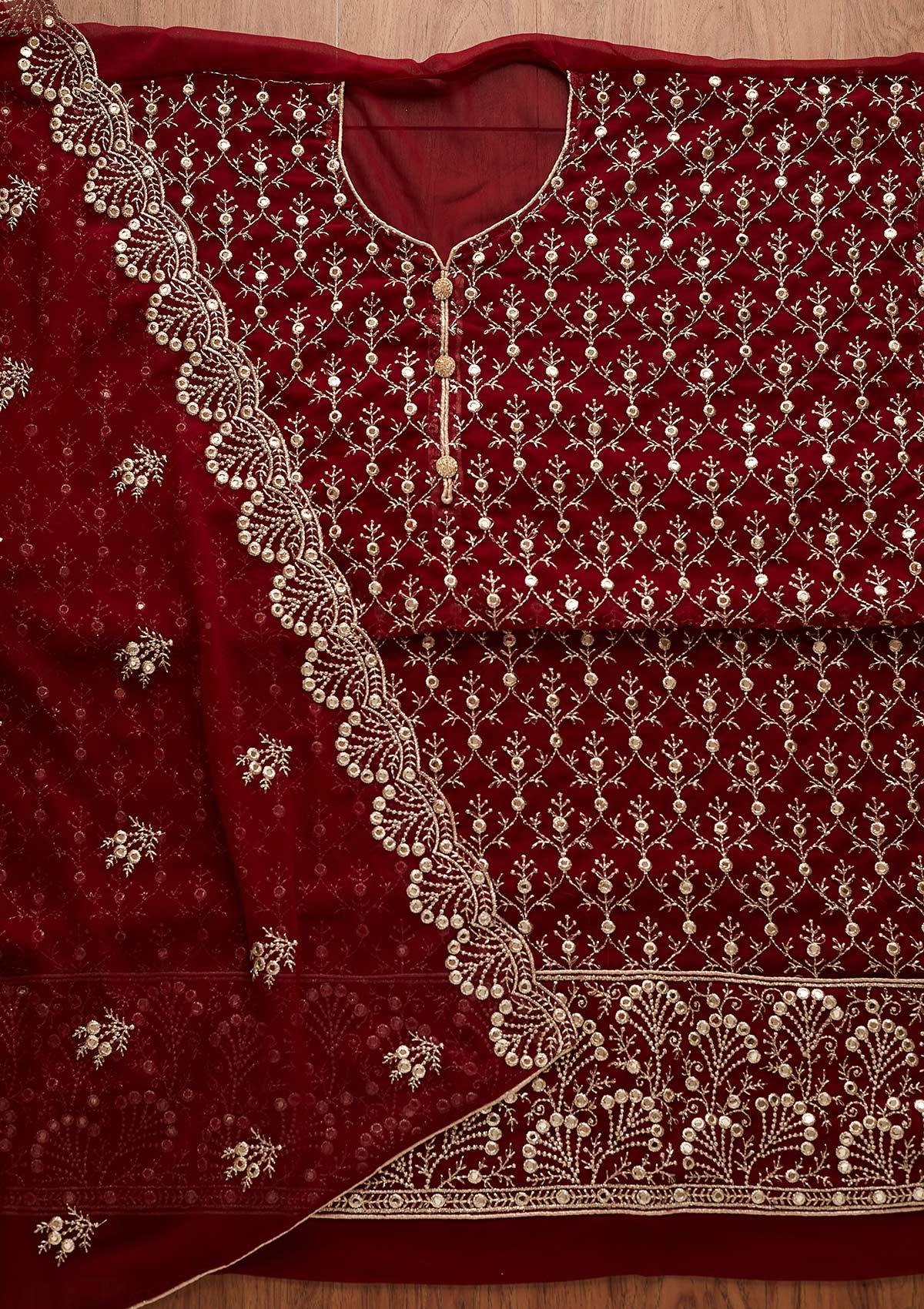 Maroon Unstitched Salwar Suit in georgette fabric. The unstitched salwar suit is elevated with swarovski embroidery. Accompanied with an unstitched botton and dupatta. Comes with the Koskii promise of premium quality.