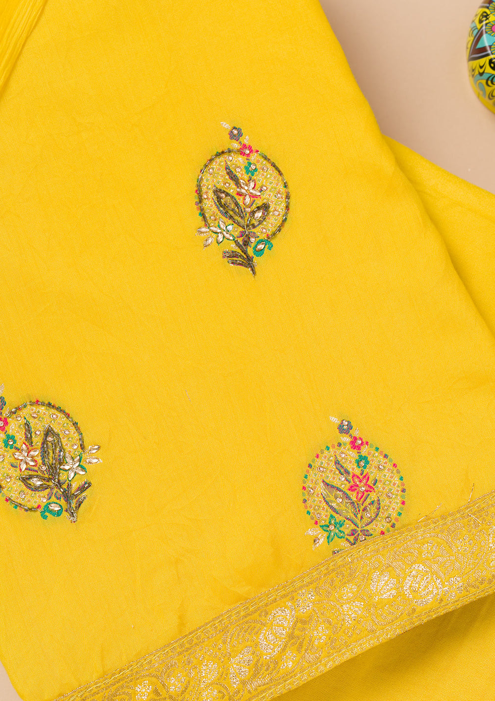 Yellow Threadwork Semi Crepe Unstitched Salwar Suit