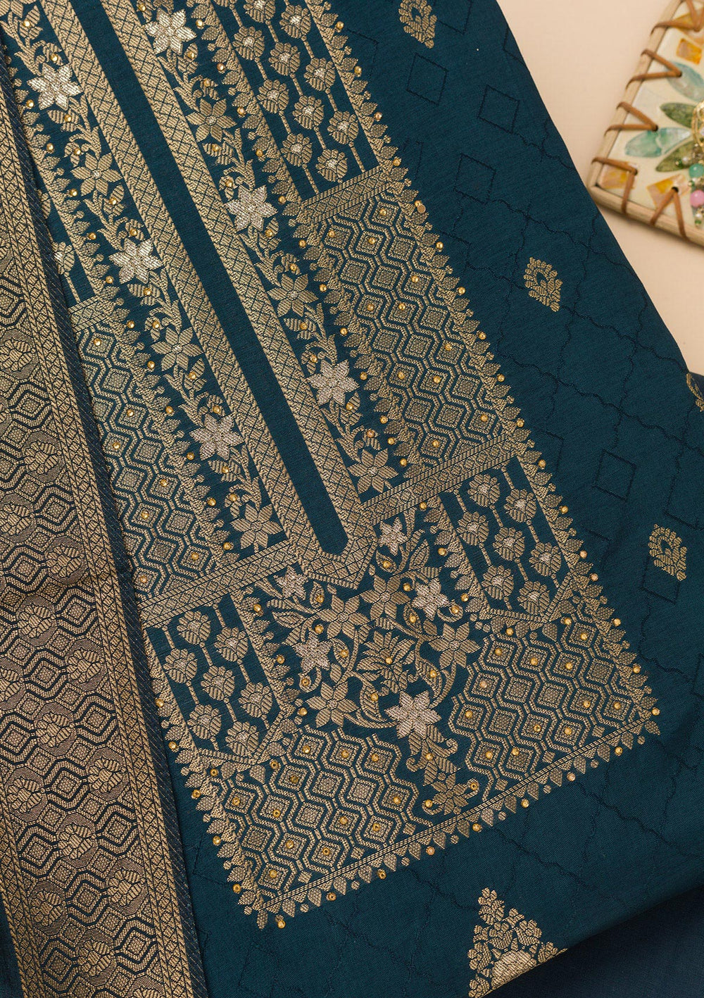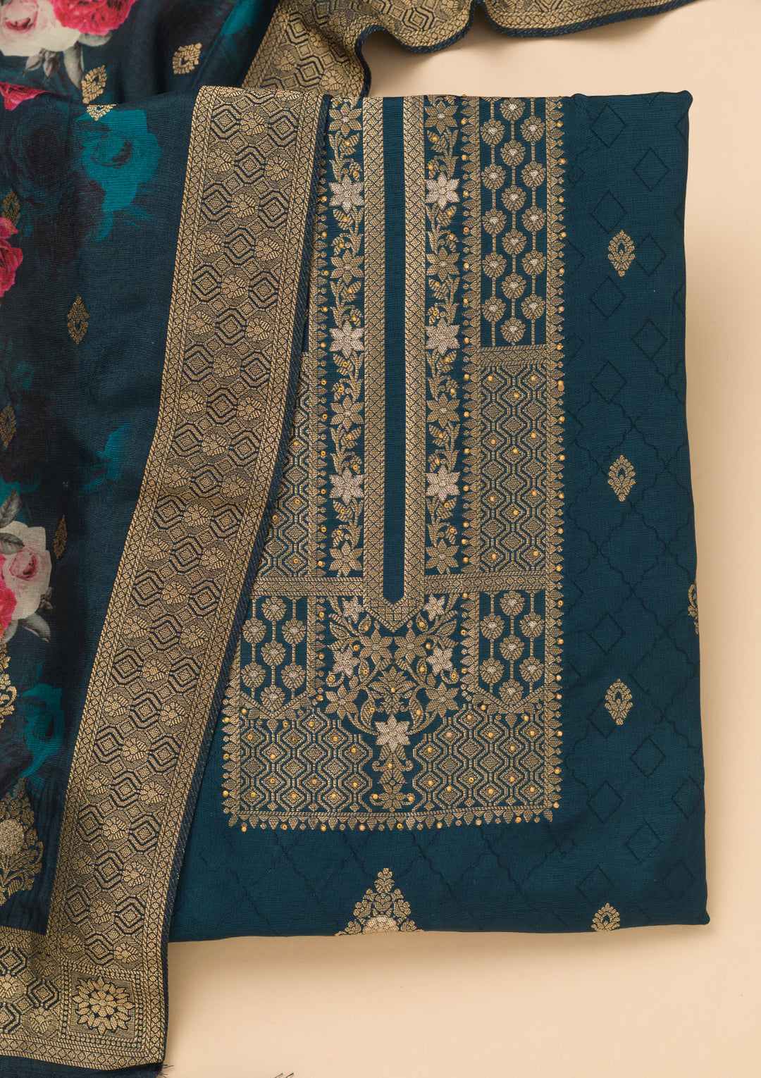 Spark a trend with Koskii's vibrant Blue Semi Crepe Salwar Suit, a canvas of creativity awaiting your personal touch. Showcasing exquisite zariwork that dances across the fabric with traditional grace, this unstitched masterpiece invites you to tailor your fit and flare. Perfect for stitching up a storm of style, it's a playful invitation to express your unique elegance at any gathering!.