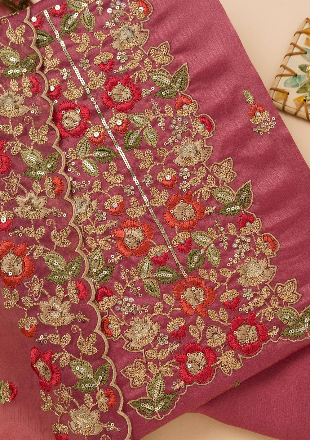 Onion Pink Zariwork Semi Crepe Unstitched Salwar Suit