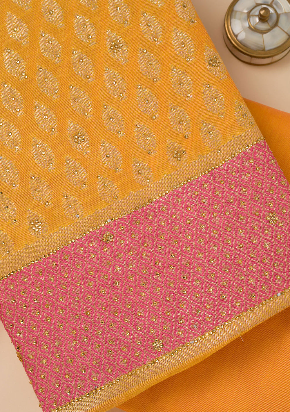 Yellow Unstitched salwar suit in Brocade fabric Elevated with ZariworkAccompanied with an unstitched bottom and dupatta Comes with the Koskii promise of premium quality.