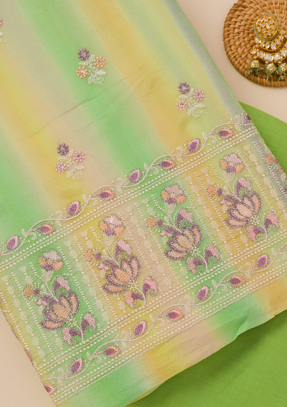 Parrot Green Threadwork Chiffon Unstitched Salwar Suit
