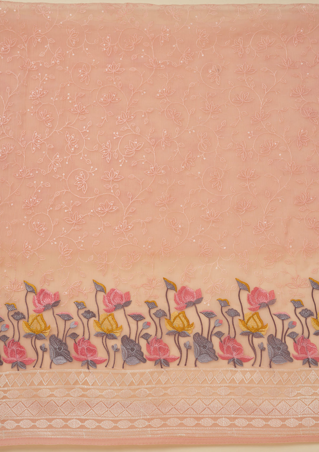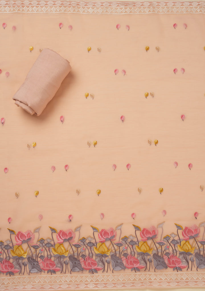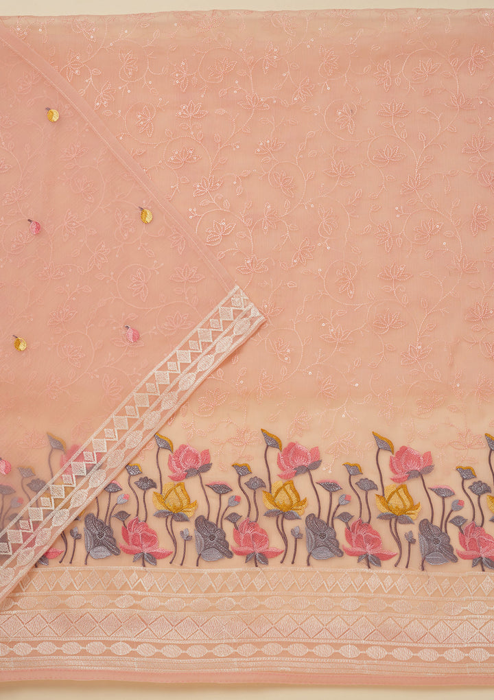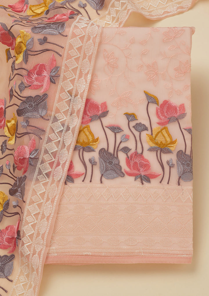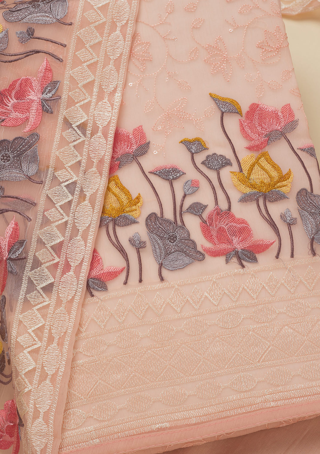 Peach Salwar Suit in Organza fabric. The Salwar Suit is embellished with Threadwork embroidery. Accompanied with a bottom and dupatta. Comes with the Koskii promise of premium quality.