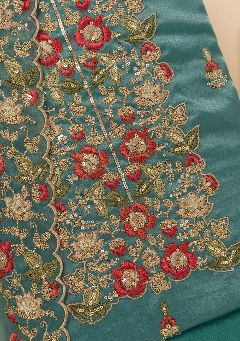 Dive into the world of color and craftsmanship with Koskii's teal Chinon Salwar Suit, a canvas of enchanting Zariwork that promises to make every moment glamorous! This unstitched marvel is your perfect partner for stitching up dreams and personal style statements. Feel the plush embrace of premium Chinon fabric and let the vivacious embroidery narrate your tale of elegance and charm!.