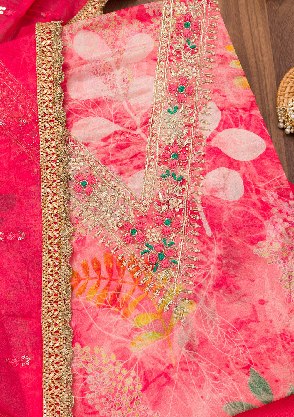 Pink Printed Semi Crepe Unstitched Salwar Suit