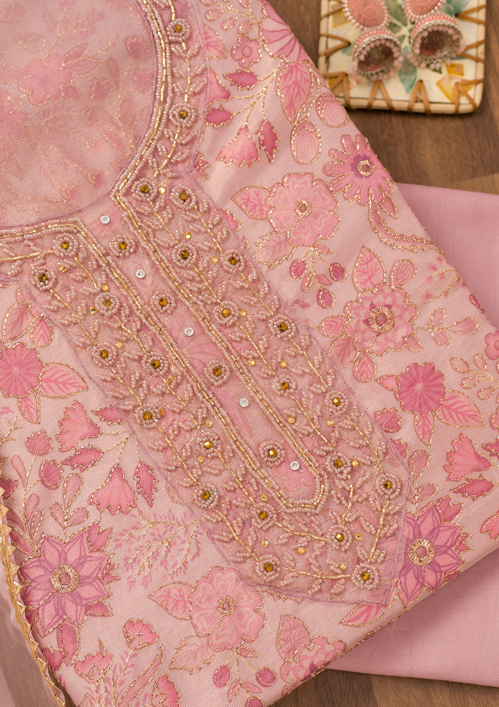 Unleash your creativity with Koskii's unstitched pink tissue salwar suit, a canvas ready for your personal touch! Dazzle in delicate cutdana embroidery that adds a sprinkle of glamour to this vibrant creation, perfect for crafting an ensemble that's truly 'you'. Light, breezy, and radiating charm, this fabric is designed for those who embrace style with spirited enthusiasm.