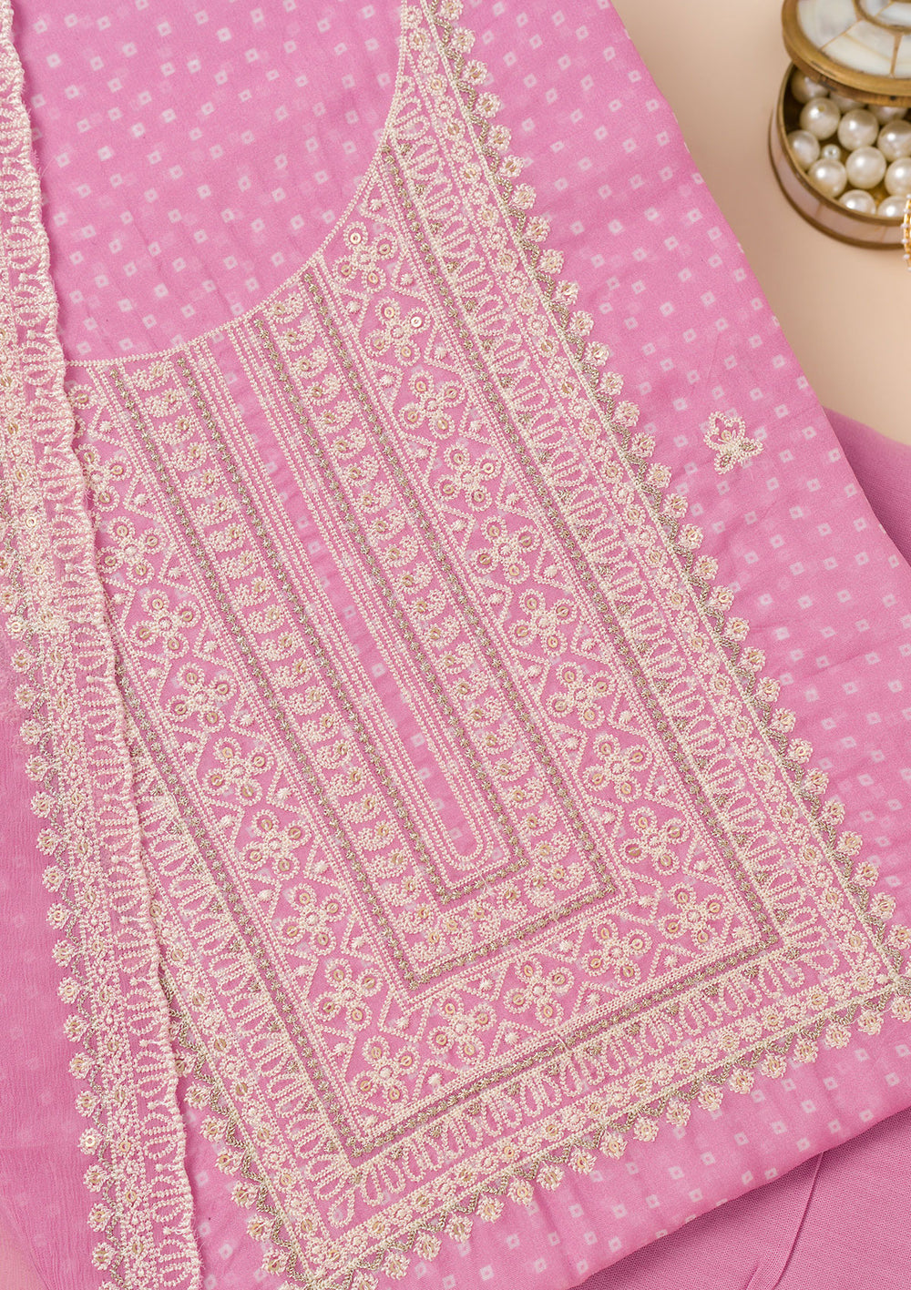 Pink Threadwork Semi Crepe Unstitched Salwar Suit