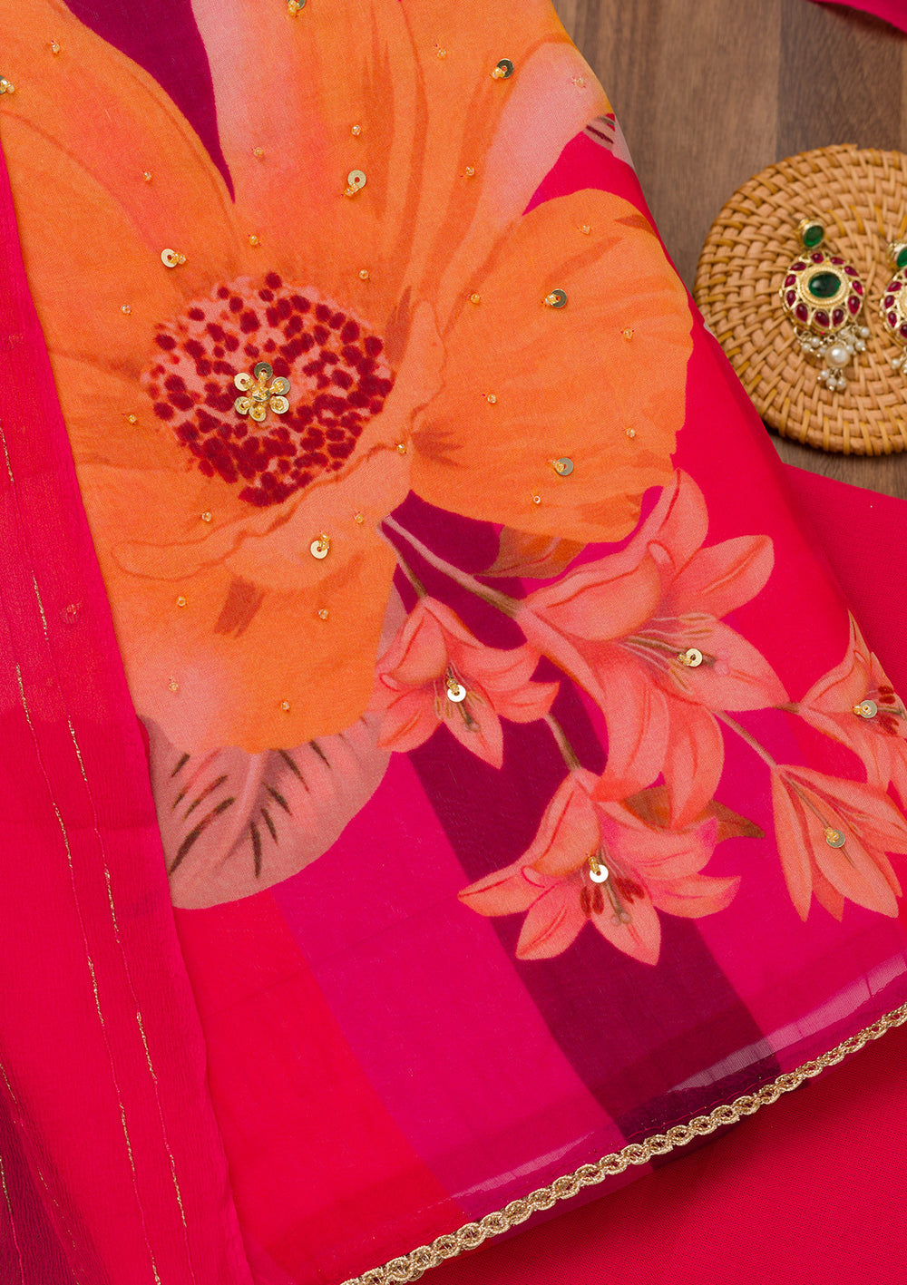 Rani Pink Salwar Suit in Tissue fabric The Salwar Suit is embellished with Printed embroidery Accompanied with a bottom and dupatta Comes with the Koskii promise of premium quality.