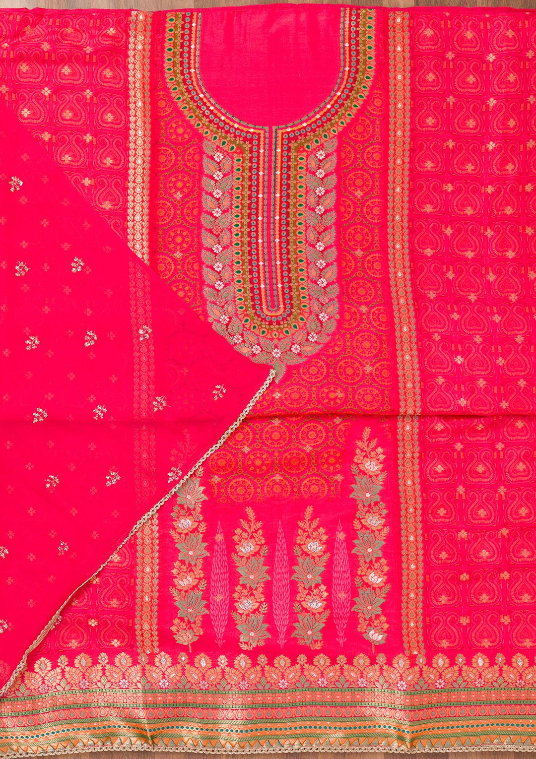 Rani Pink Zariwork Semi Crepe Unstitched Salwar Suit