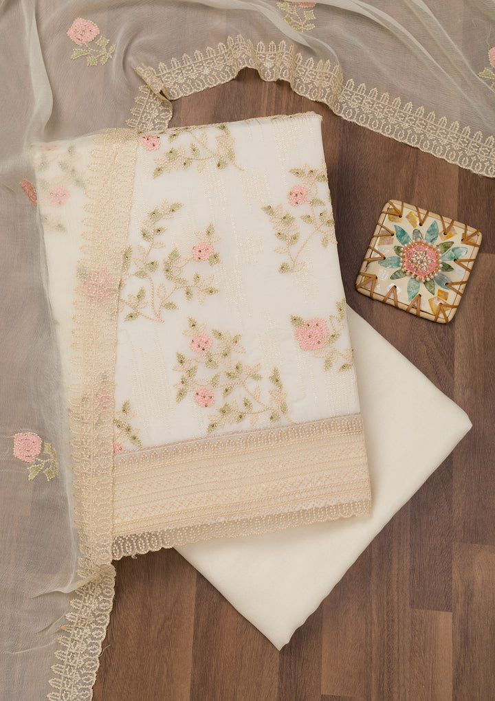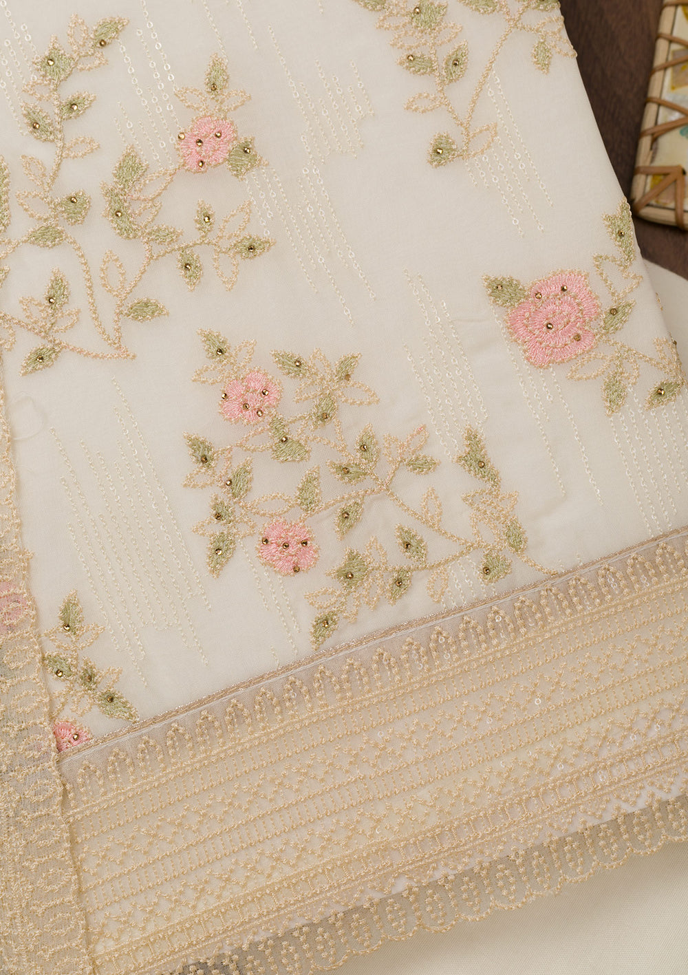 White Salwar Suit in Georgette fabric. The Salwar Suit is embellished with Threadwork embroidery. Accompanied with a bottom and dupatta. Comes with the Koskii promise of premium quality.