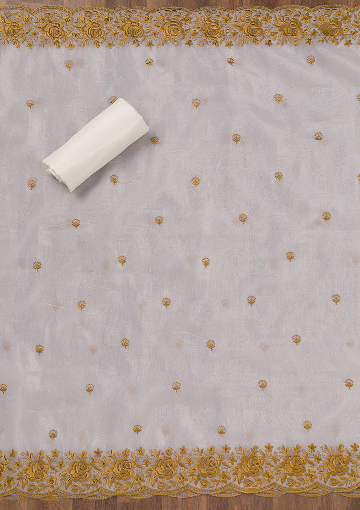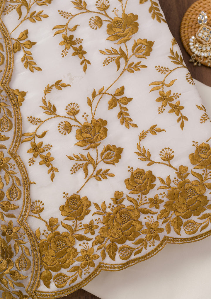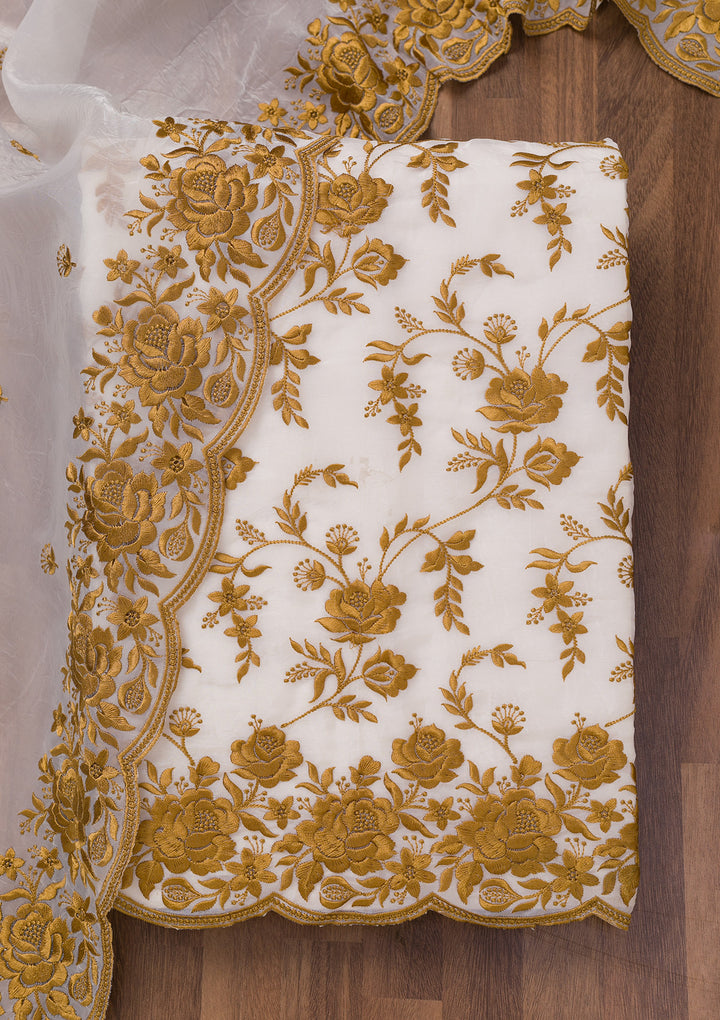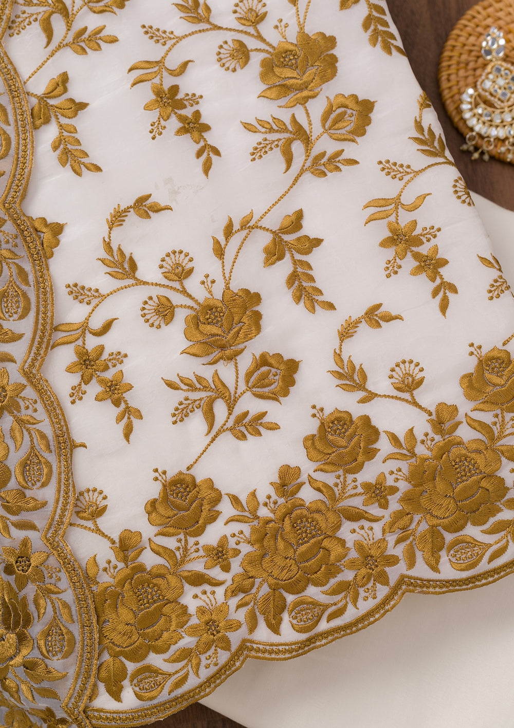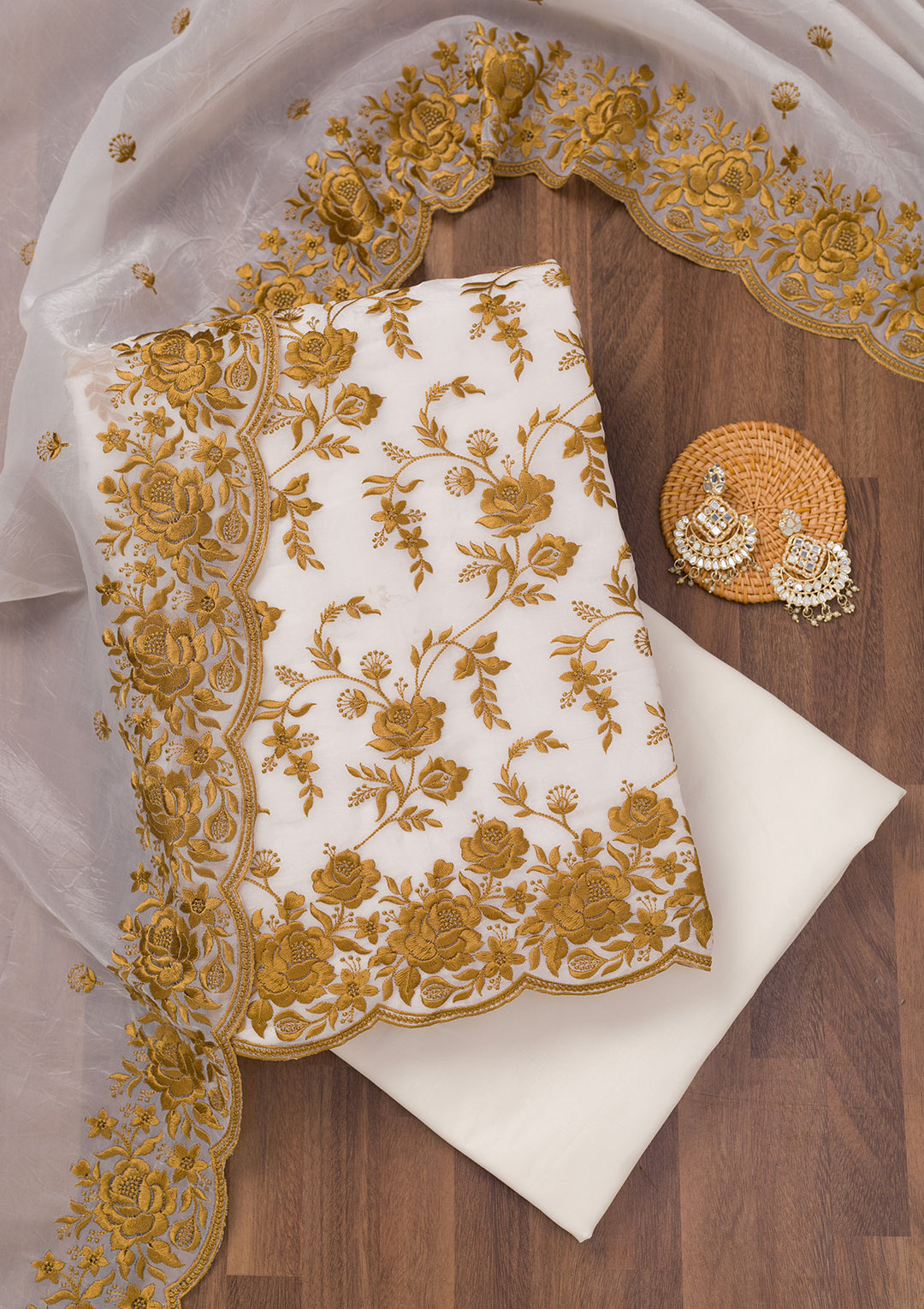 White Salwar Suit in Tissue fabric. The Salwar Suit is embellished with Threadwork embroidery. Accompanied with a bottom and dupatta. Comes with the Koskii promise of premium quality.