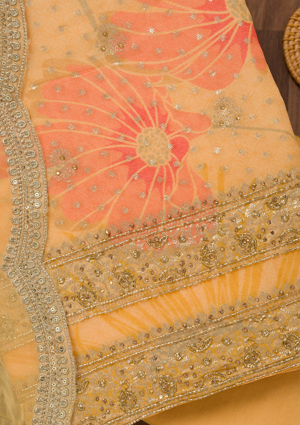 Unleash the power of your vibrant personality with Koskii’s dazzling gold Chinon Salwar Suit, featuring a playful dance of stonework embroidery that captures the essence of joyful elegance. This radiant, unstitched piece lets you tailor a celebration of your unique style, enveloping you in a fabric that’s as luxurious as it is lively. Koskii celebrates your spirit with every thread of this exquisite ensemble!.