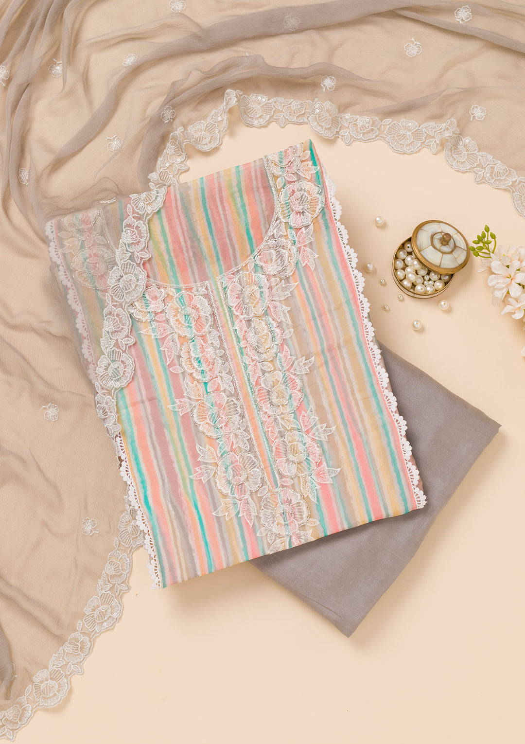 | Grey Threadwork Semi Crepe Unstitched Salwar Suit | ₹ 2,994 | |