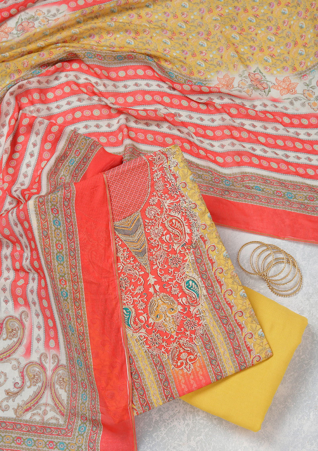 | Yellow Zariwork (Gold) Semi Crepe Unstitched Salwar Suit | ₹ 2,392 | |