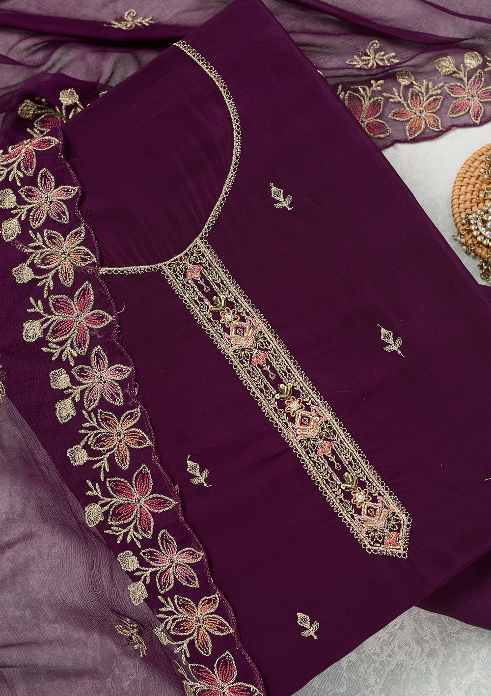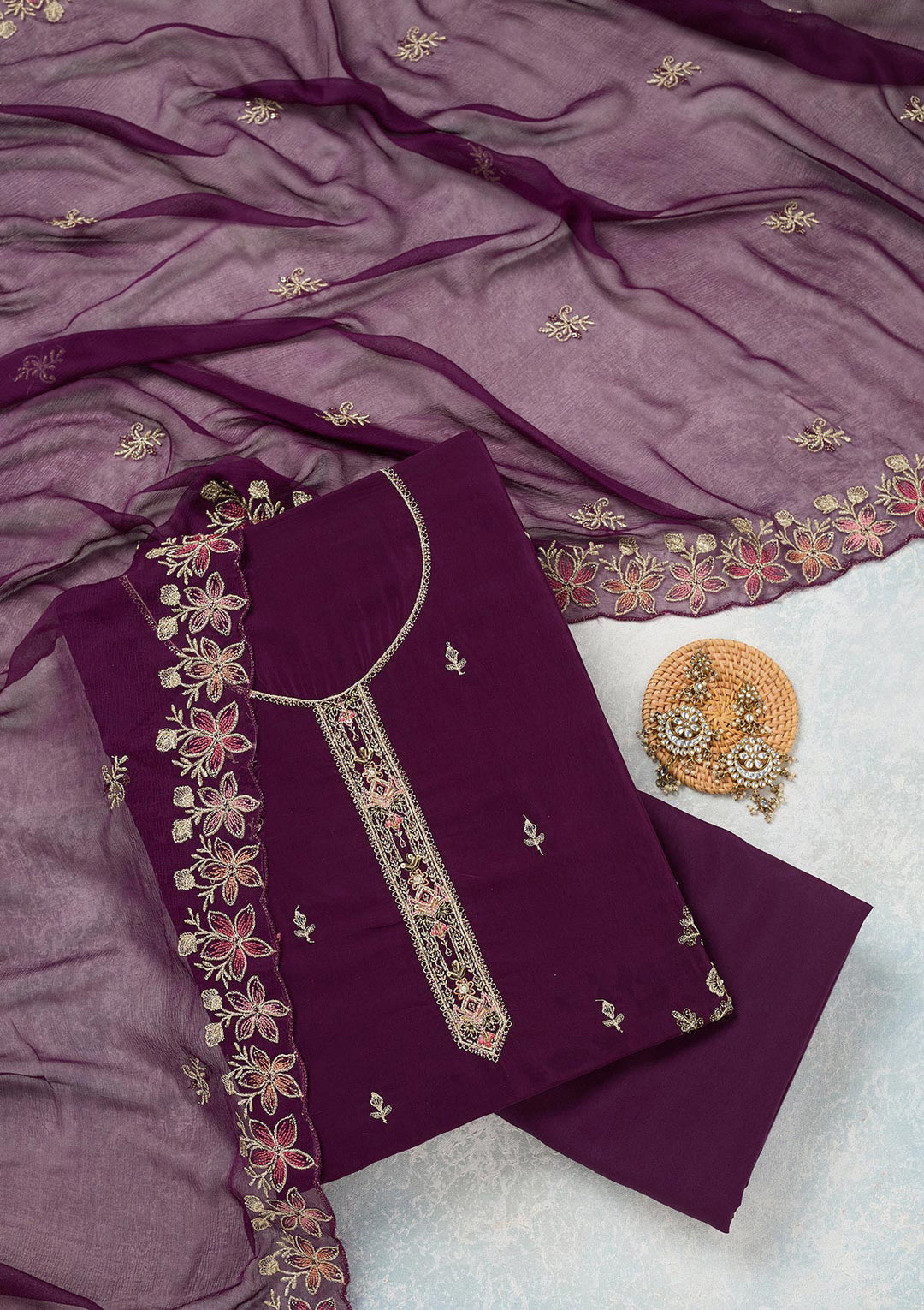 | Pink Threadwork Organza Unstitched Salwar Suit | ₹ 3,495 | |