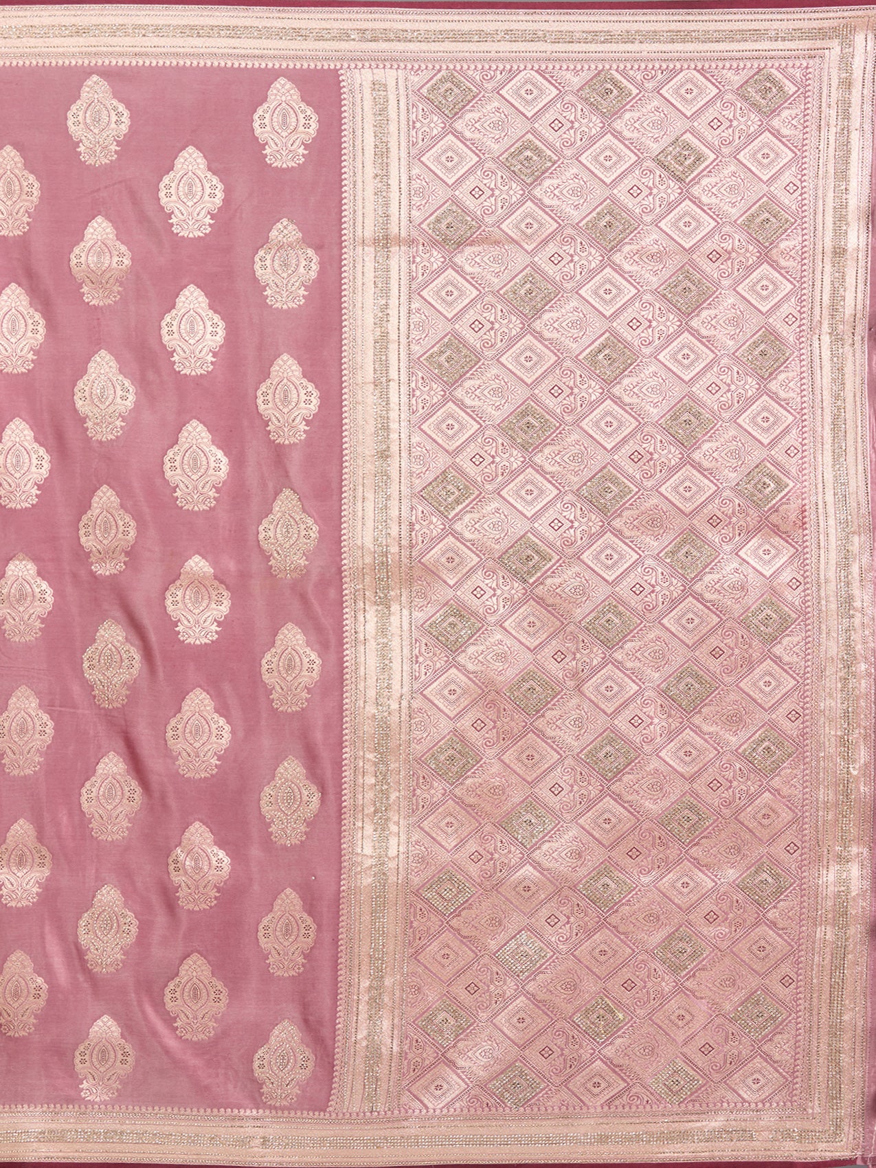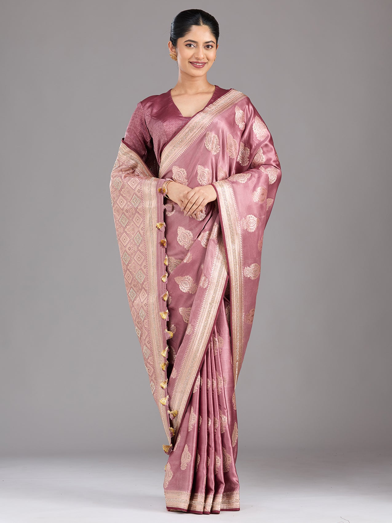 Mauve Silk Saree in Silk fabric. The Silk Saree is elevated with Stonework (Gold) embroidery. It comes with an Unstitched blouse. Comes with the Koskii promise of premium quality.