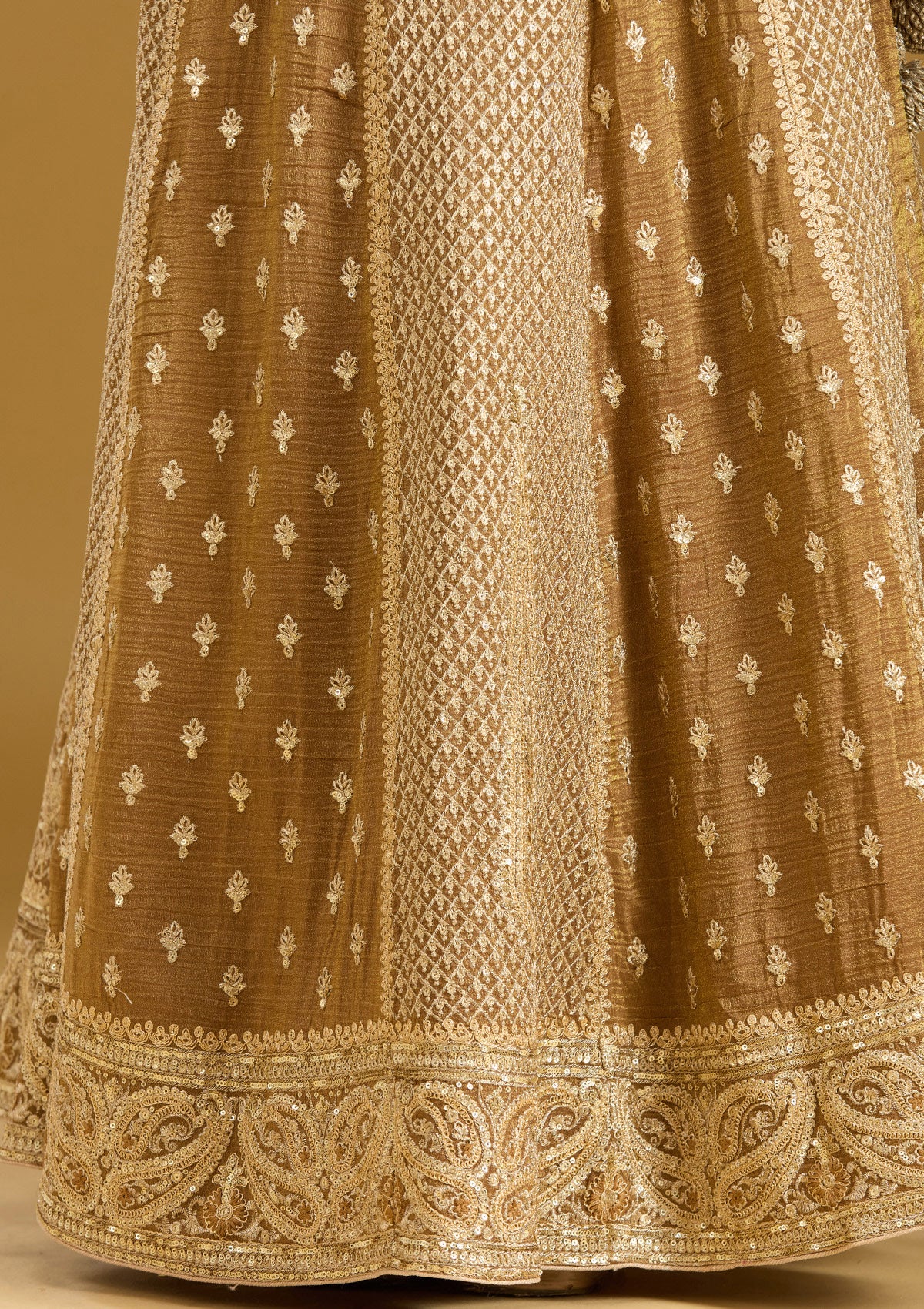 Mehendi Salwar Suit in Tissue fabric. The Salwar Suit is embellished with Cutdana embroidery. Accompanied with a bottom and dupatta. Comes with the Koskii promise of premium quality.