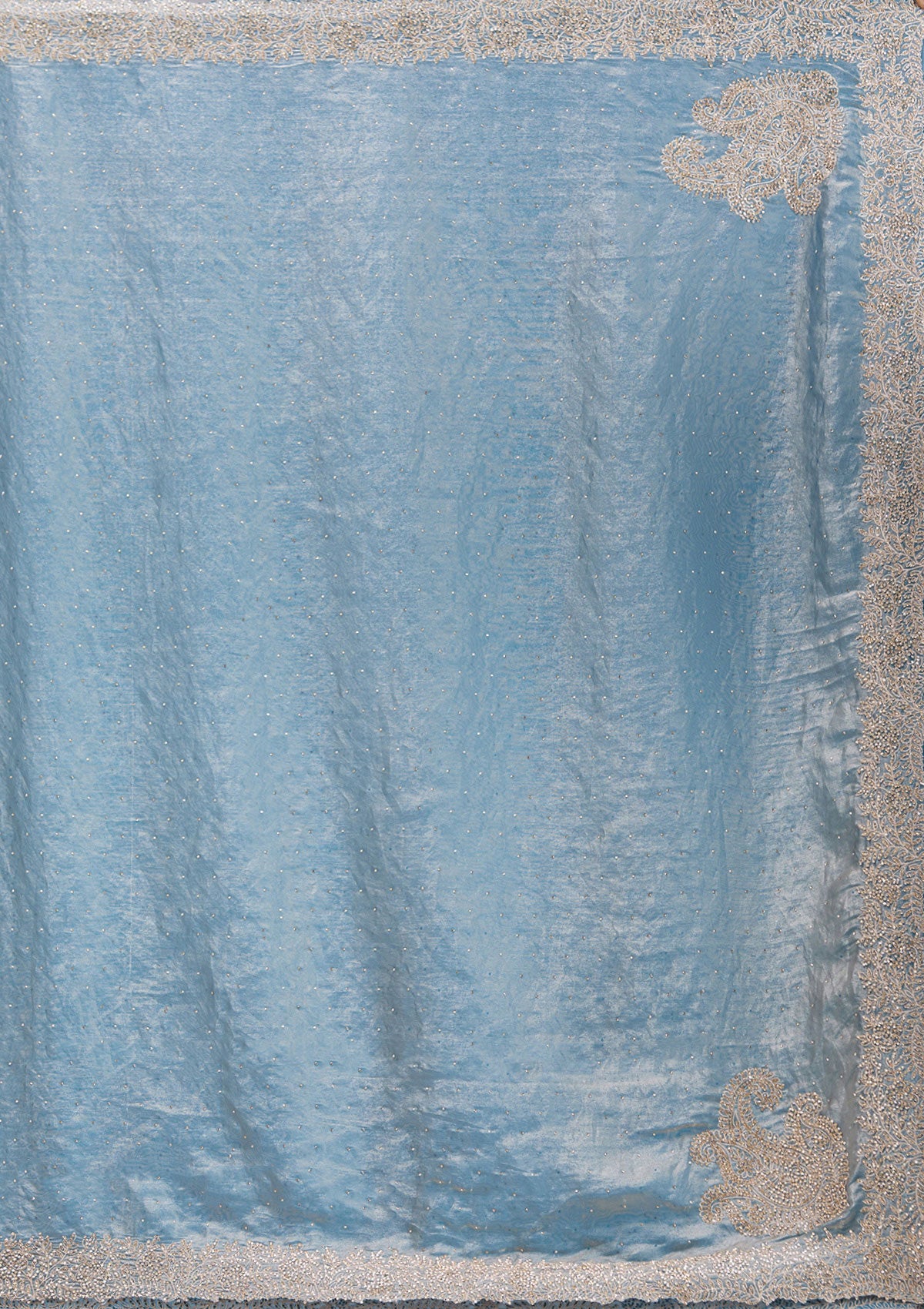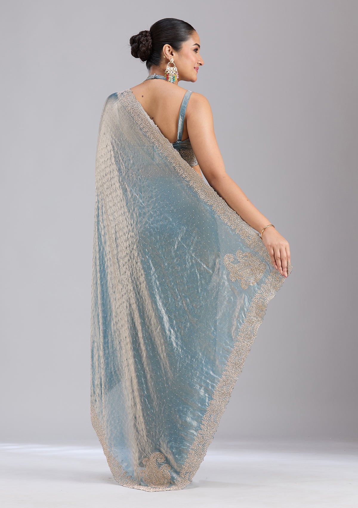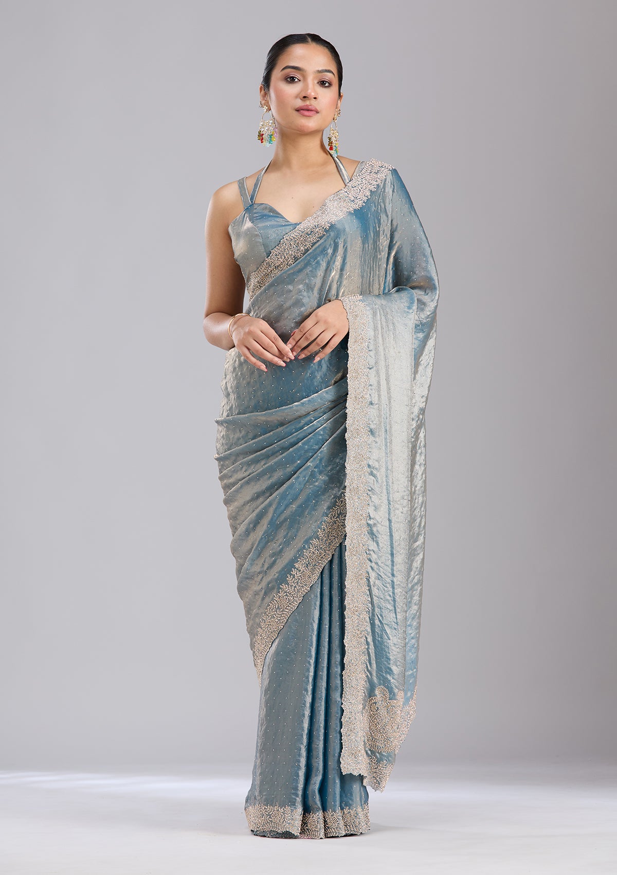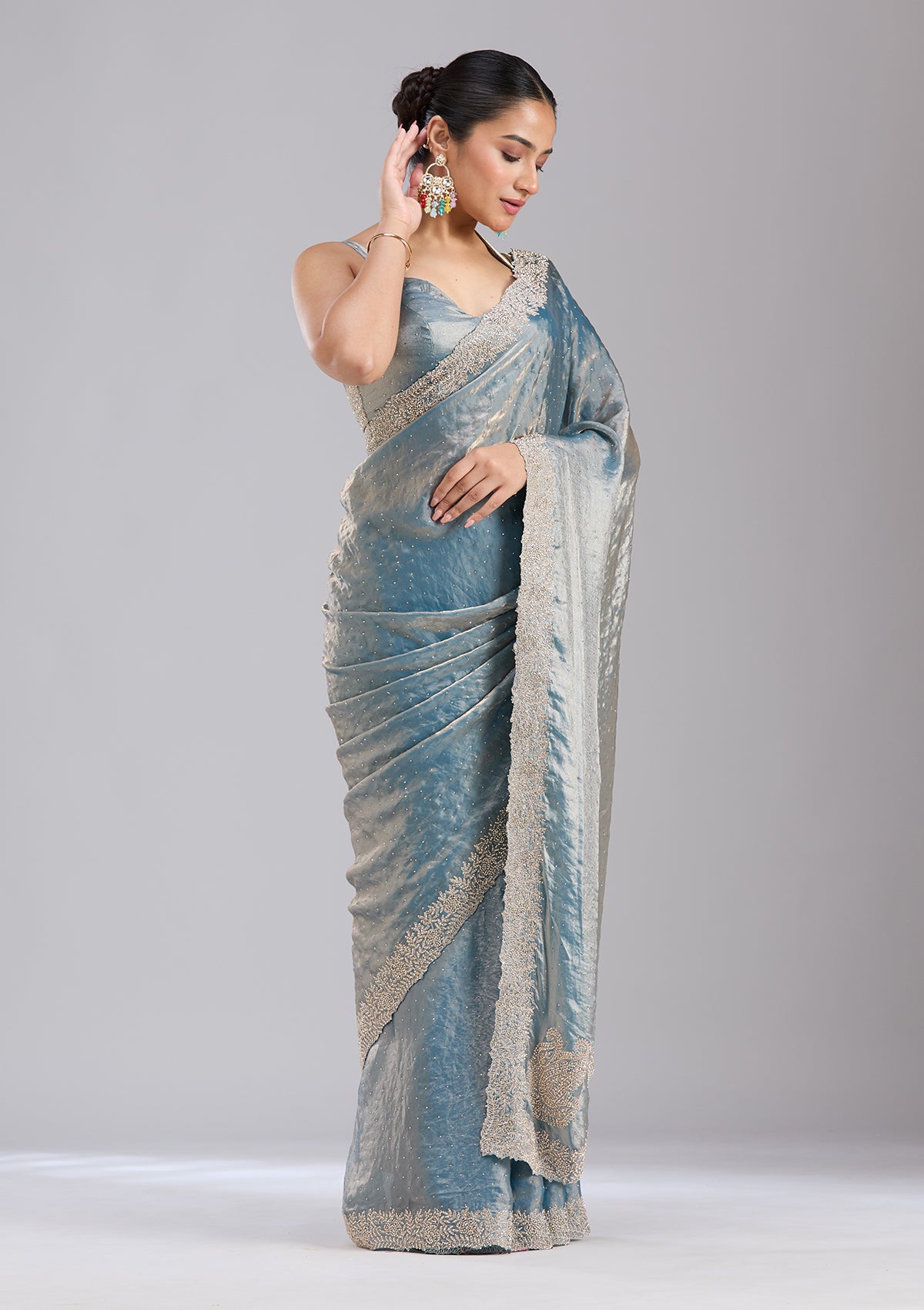 Grey Saree in Tissue fabric The Saree is elevated with Stonework (Gold) embroidery It comes with an Unstitched blouse Comes with the Koskii promise of premium quality.