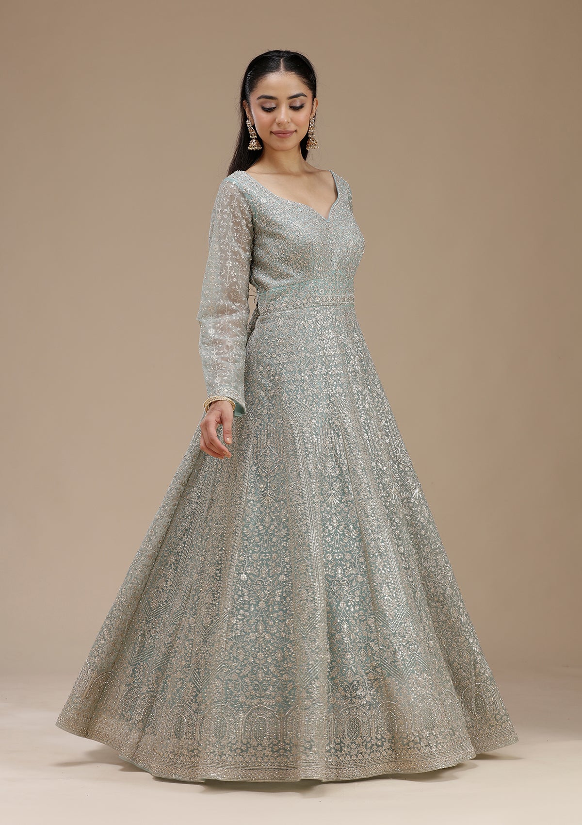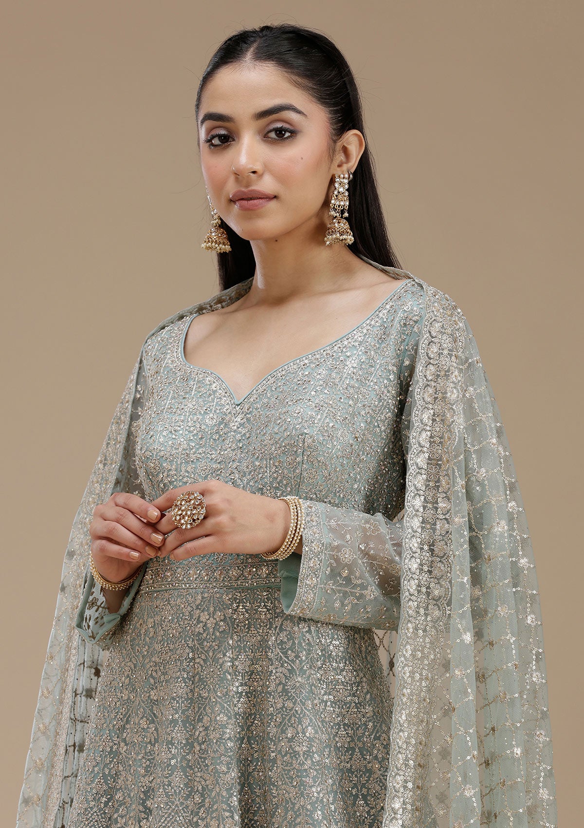 Sky Blue Salwar Suit in Net fabric. The Salwar Suit is embellished with Zariwork (Gold) embroidery. Accompanied with a bottom and dupatta. Comes with the Koskii promise of premium quality.