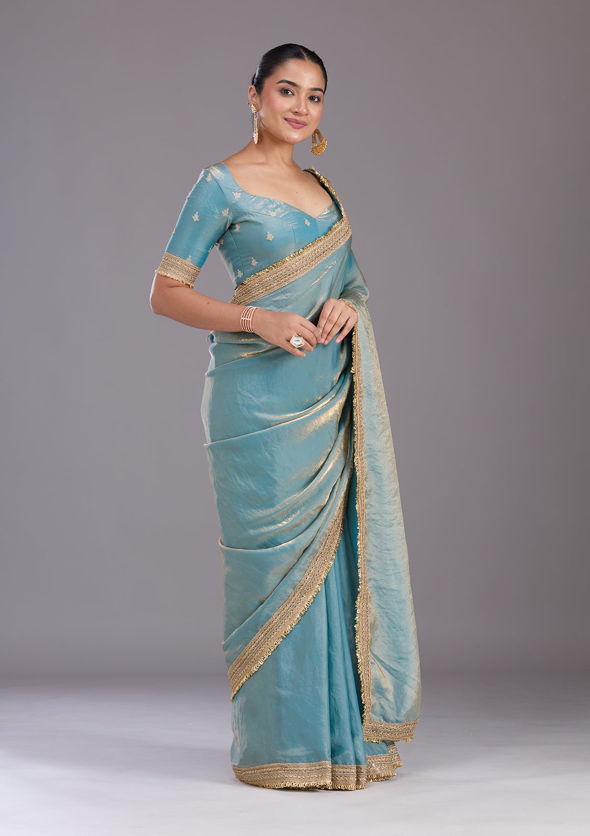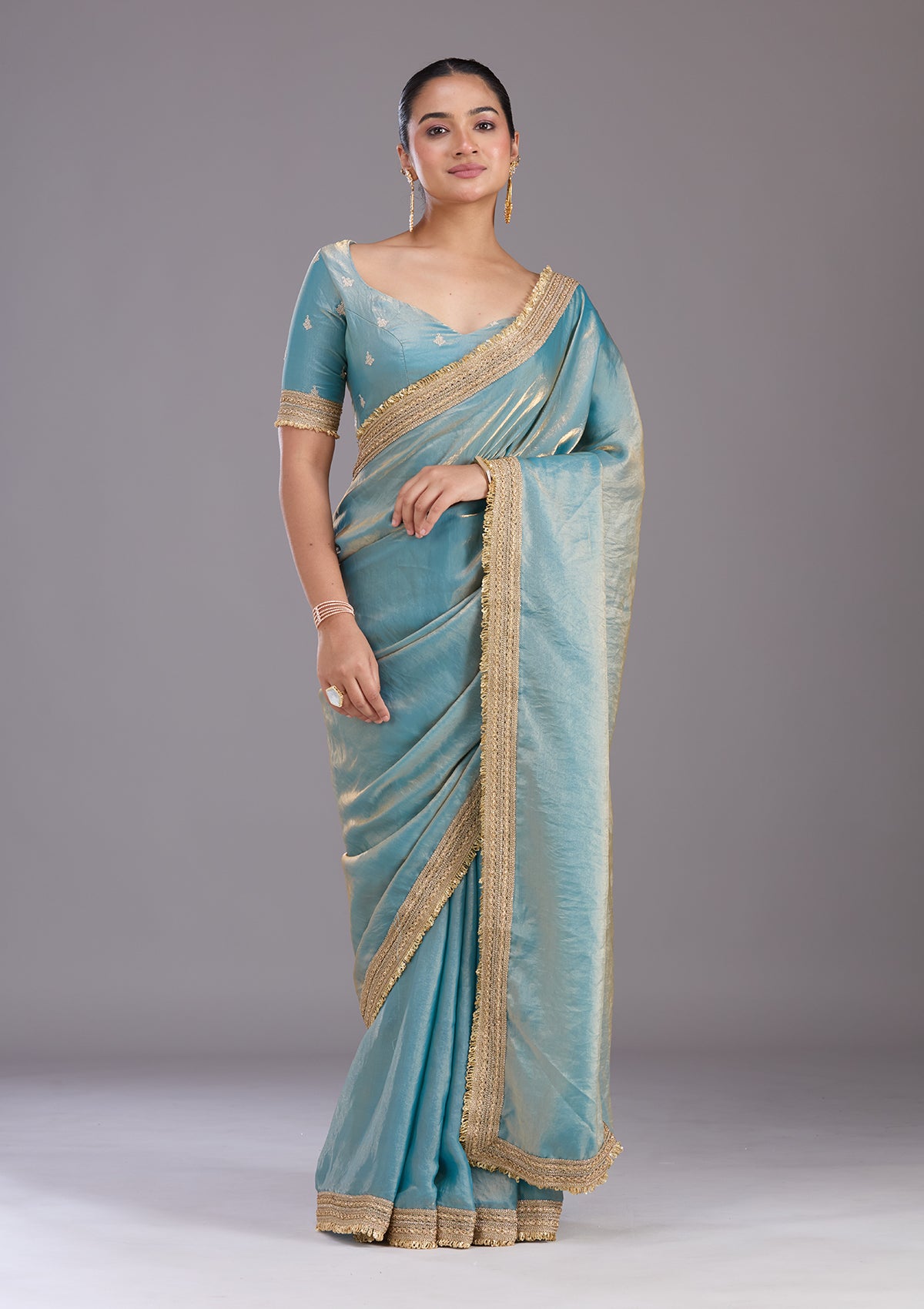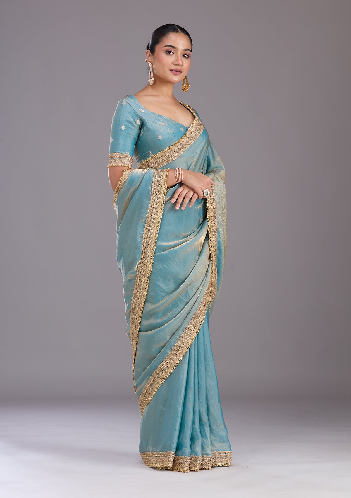 Blue Saree in Tissue fabric. The Saree is elevated with Zariwork (Gold) embroidery. It comes with an Unstitched blouse. Comes with the Koskii promise of premium quality.