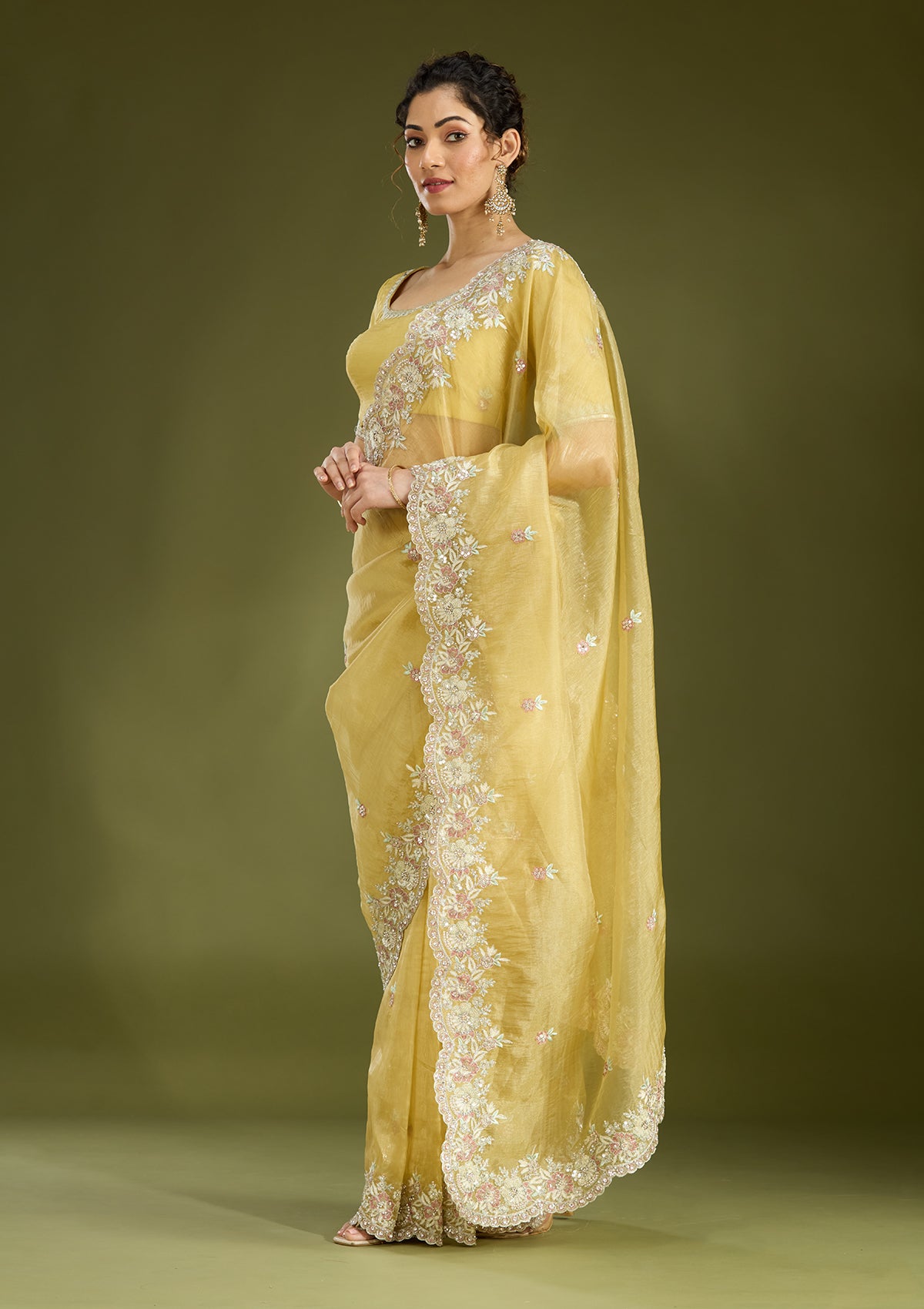 Lemon Yellow Saree in Tissue fabric. The Saree is elevated with Sequins embroidery. It comes with an Unstitched blouse. Comes with the Koskii promise of premium quality.
