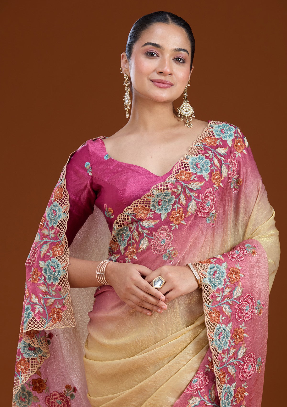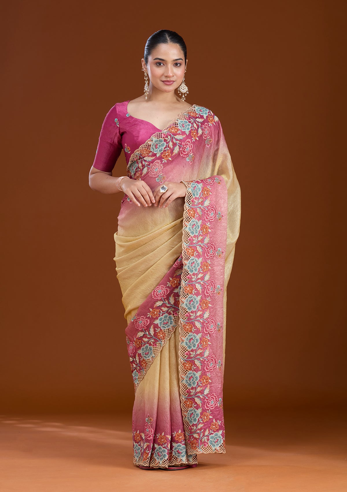 Magenta Pink Saree in Tissue fabric. The Saree is elevated with Threadwork embroidery. It comes with an Unstitched blouse. Comes with the Koskii promise of premium quality.