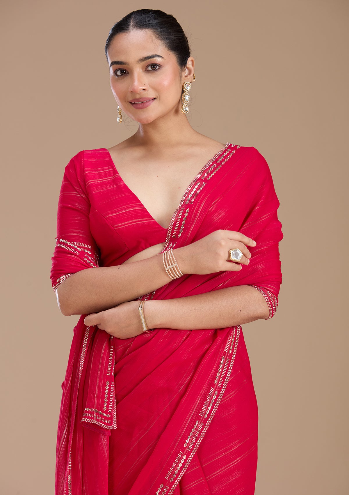 Rani Pink Saree in Chiffon fabric. The Saree is elevated with Stonework (Gold) embroidery. It comes with an Unstitched blouse. Comes with the Koskii promise of premium quality.