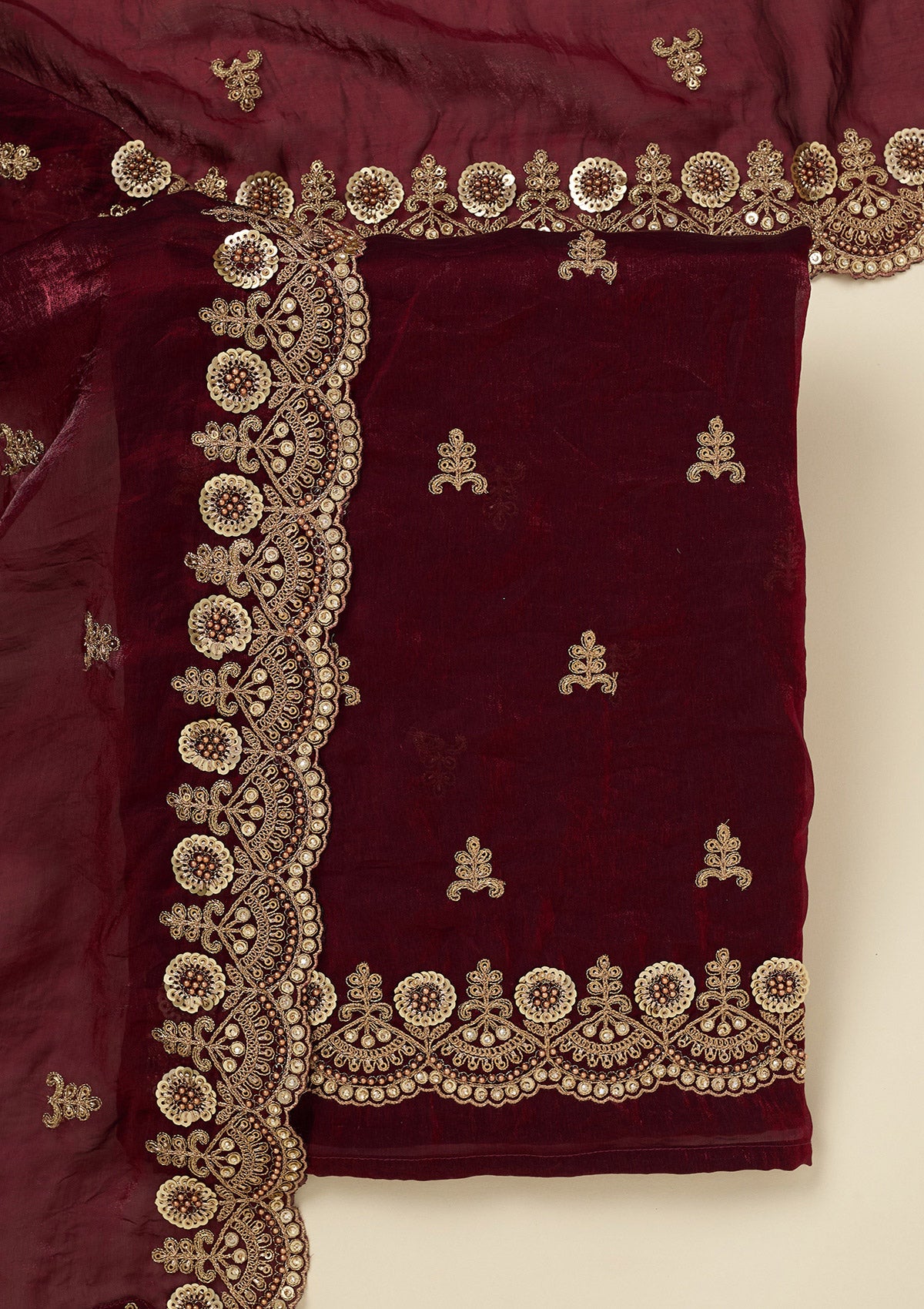 Maroon Salwar Suit in Organza fabric. The Salwar Suit is embellished with Cording embroidery. Accompanied with a bottom and dupatta. Comes with the Koskii promise of premium quality.