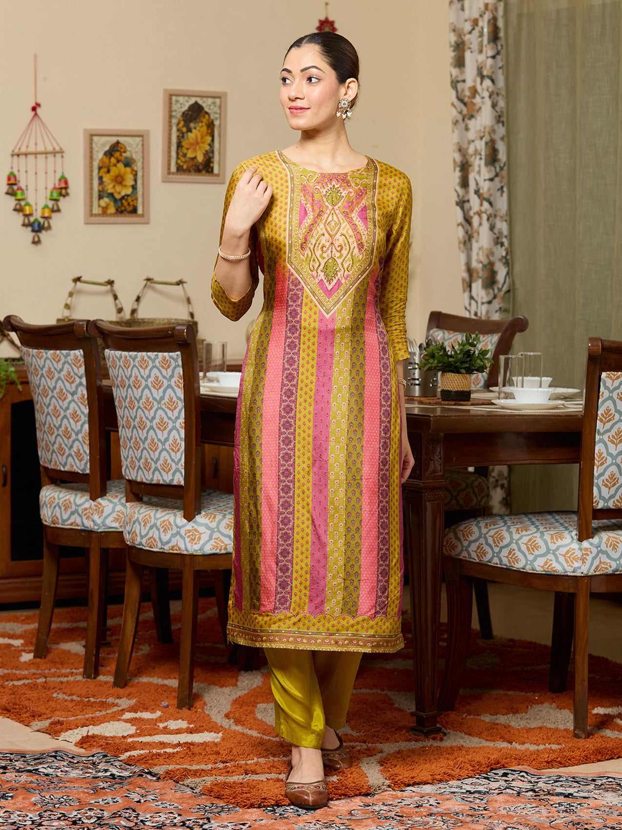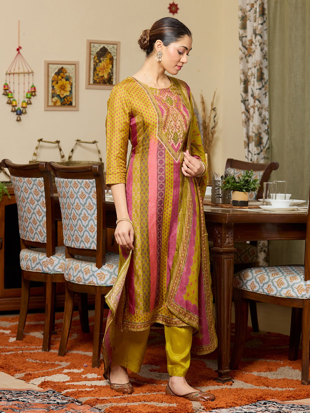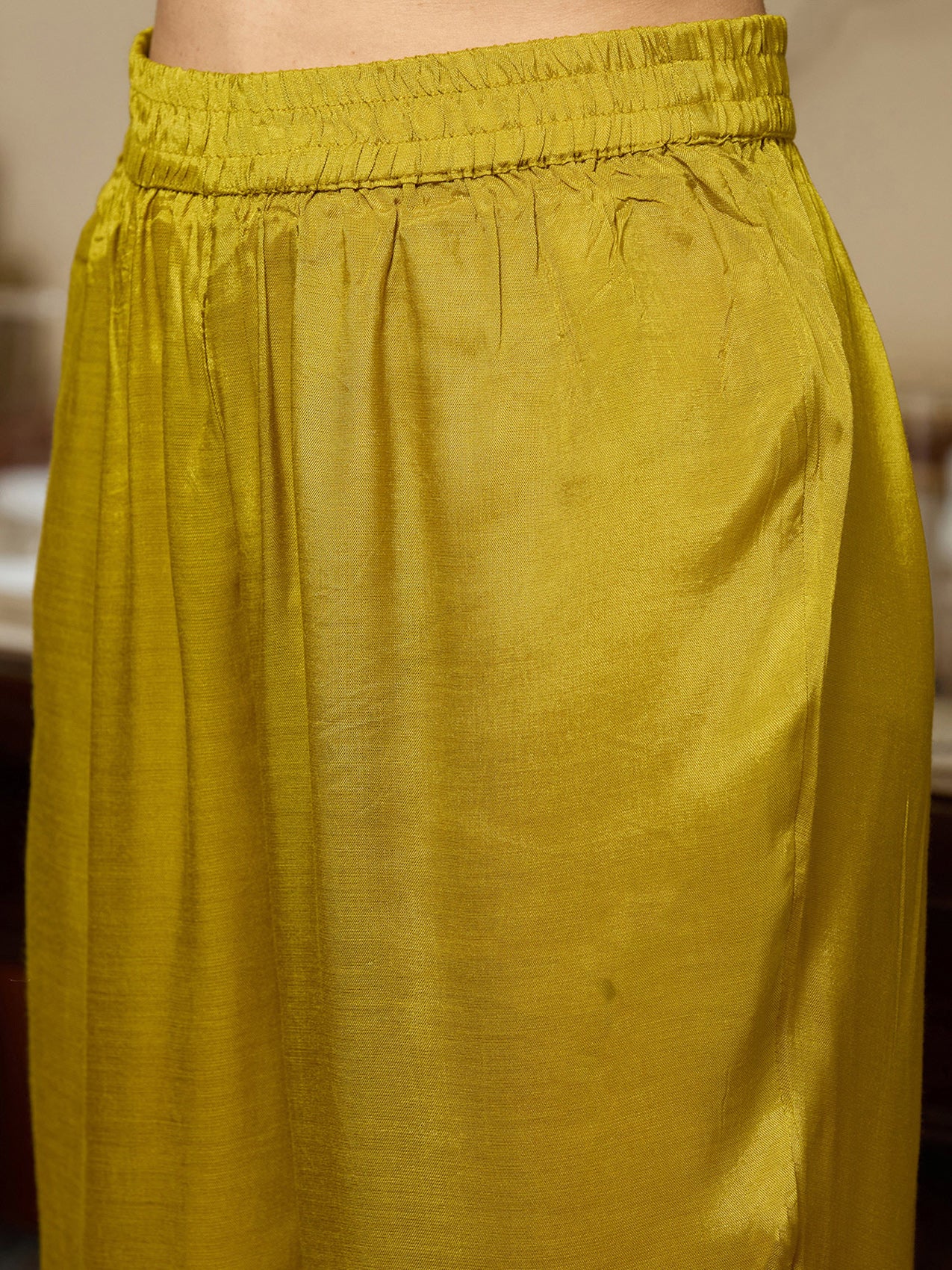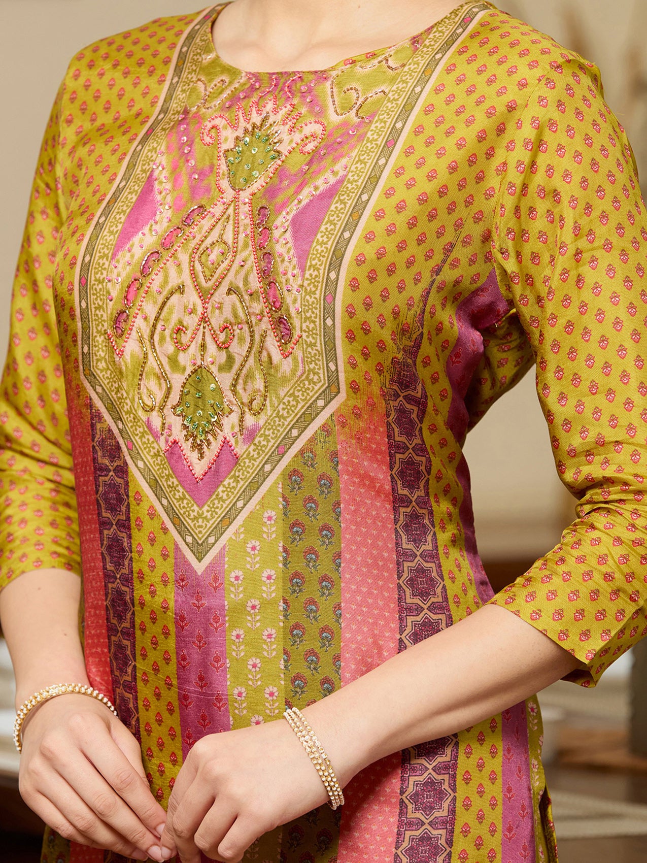 Mehandi Green Salwar Suit in Satin fabric. The Salwar Suit is embellished with Cutdana embroidery. Accompanied with a bottom and dupatta. Comes with the Koskii promise of premium quality.