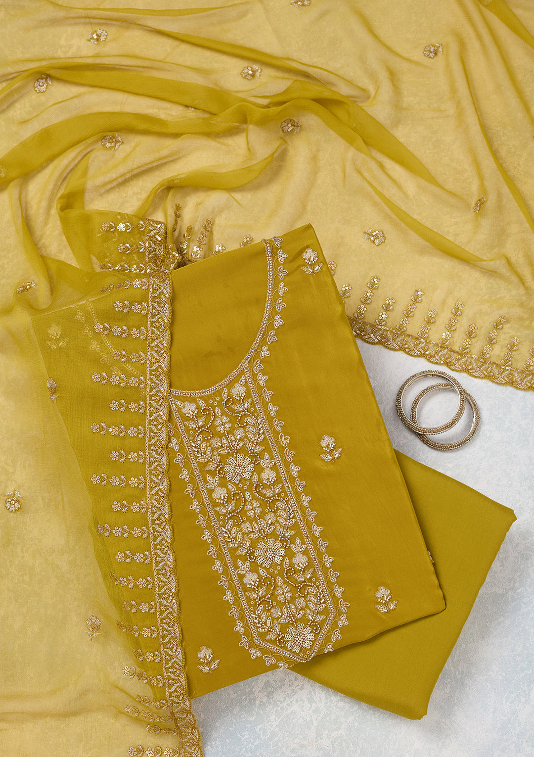 | Rama Green Zariwork (Gold) Semi Crepe Unstitched Salwar Suit | ₹ 7,992 | |