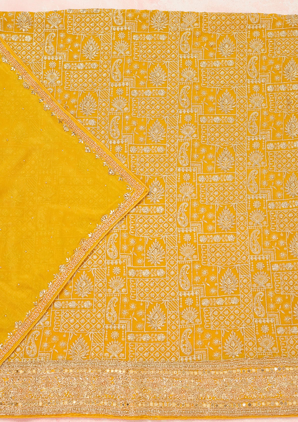 Yellow Salwar Suit in Georgette fabric. The Salwar Suit is embellished with Zariwork (Gold) embroidery. Accompanied with a bottom and dupatta. Comes with the Koskii promise of premium quality.