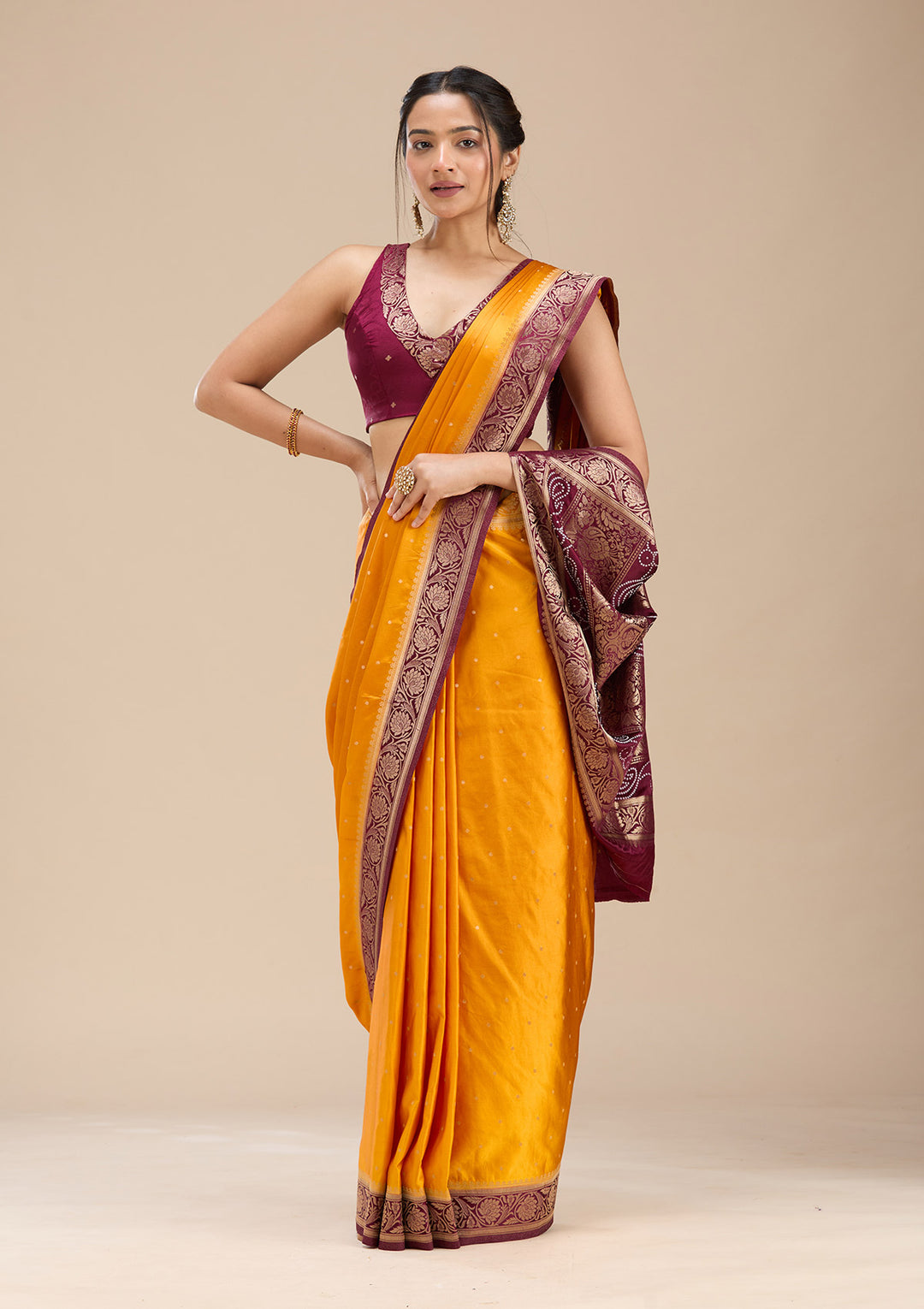 - Be sassy in a Haldi saree: The Haldi saree is the traditional attire for the bride for the ceremony. Drape yourself in a simple Haldi saree with a sleeveless blouse, and you will be effortlessly chic. You can even wear pale pink or light green blouses with short or cap sleeves if you want to add some colour and coverage. Go for contrasting jewellery in green or red.