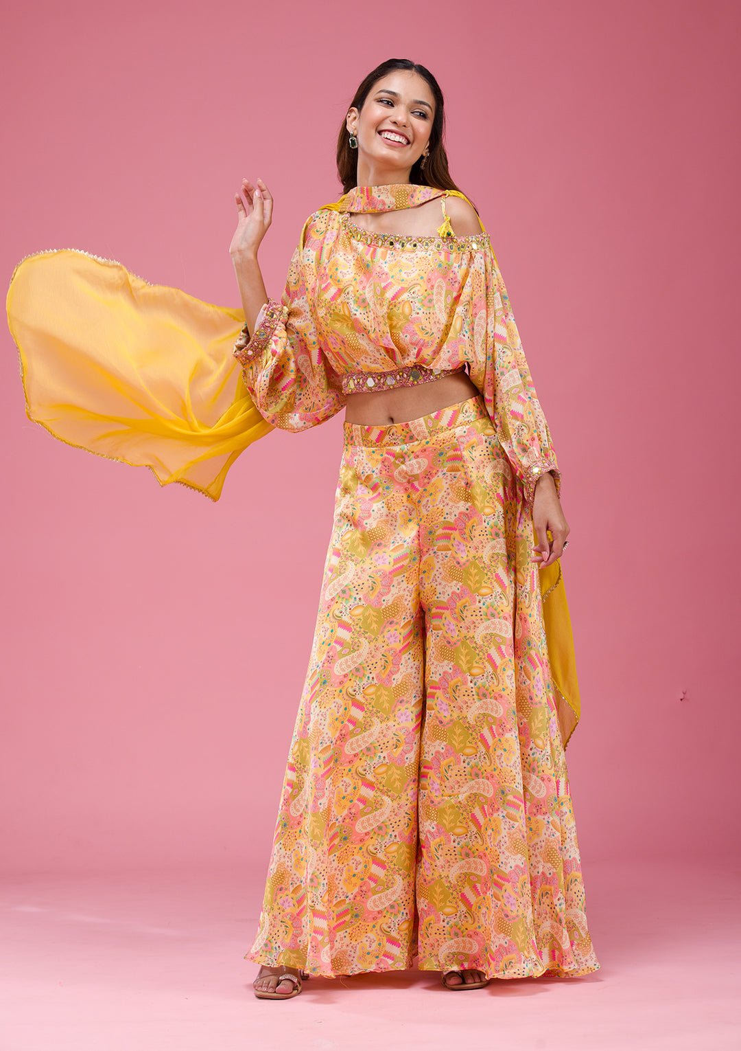 - Comfortable in a crop top and skirt: Get creative with your Haldi outfit. Pair a printed or heavily embroidered lehenga skirt in yellow with a pale pink crop top for an Indo-Western fusion look, or style a glittering bralette with a lehenga skirt for some fashionista flair.