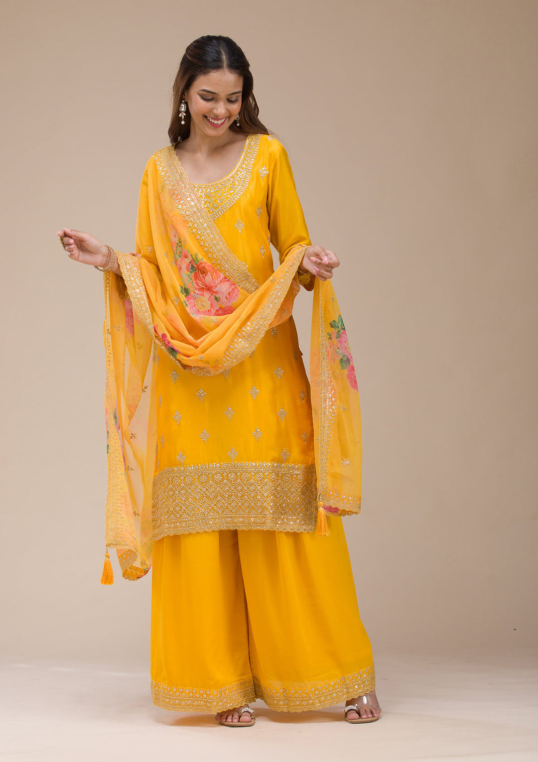 - Forever young in a sharara suit: The simplest Haldi ceremony dress is not a dress at all. A sharara suit offers comfort, elegance, and glamour simultaneously. Imagine sitting cross-legged in a pale yellow sharara suit with a white crop top. Pair your sharara suit with a dupatta for extra coverage when needed.