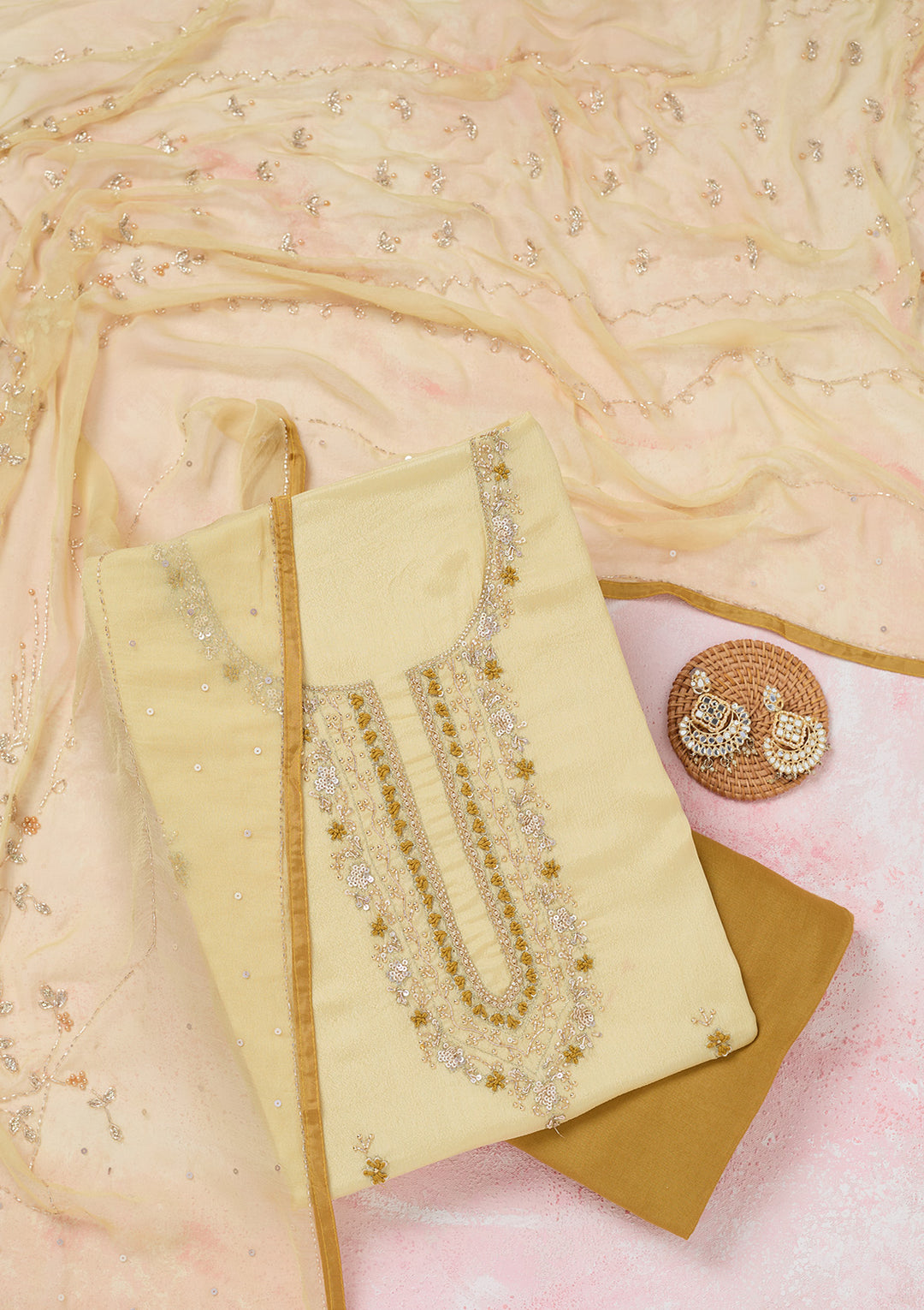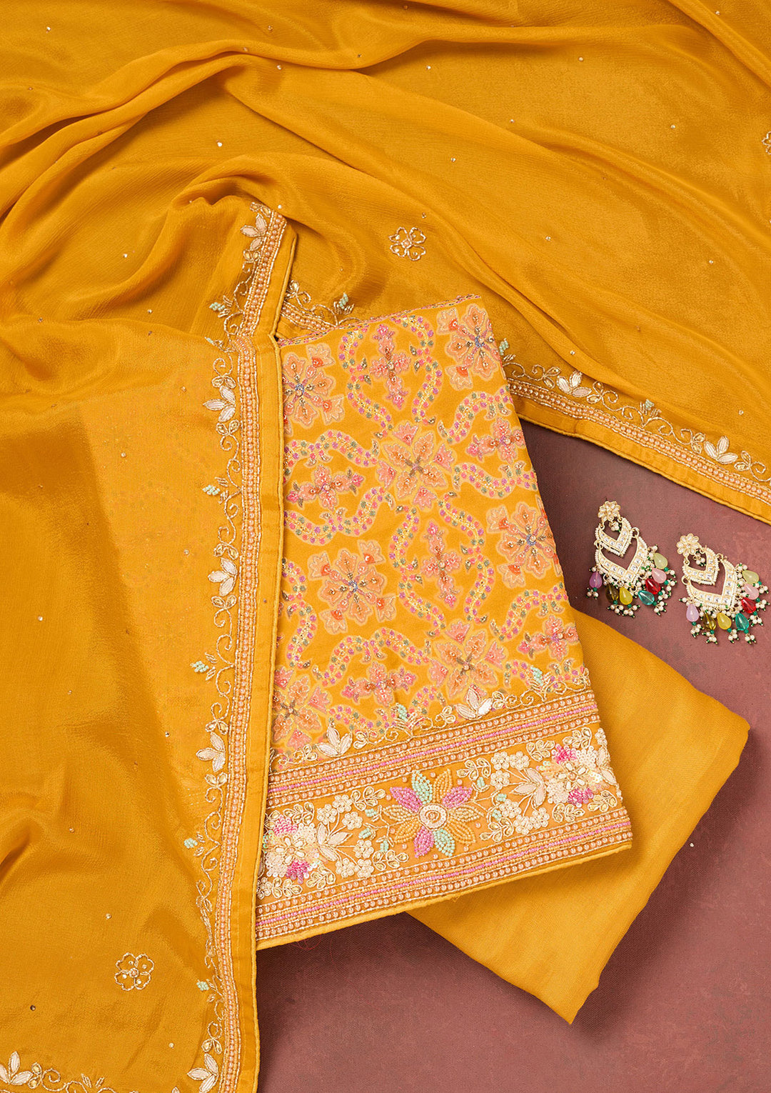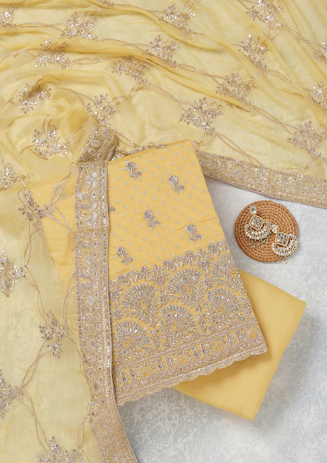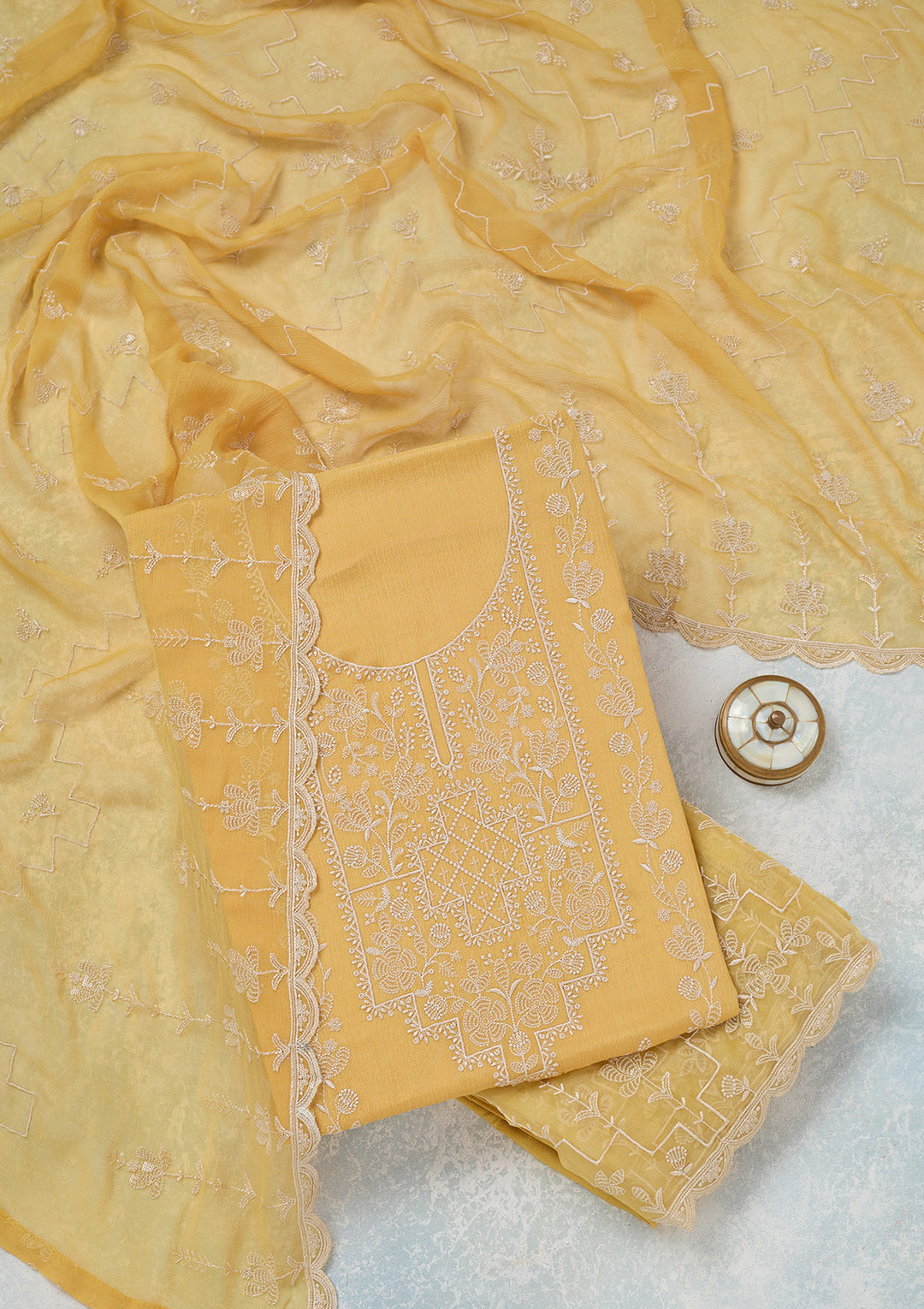 | Yellow Threadwork Chinon Unstitched Salwar Suit | ₹ 3,592 | |