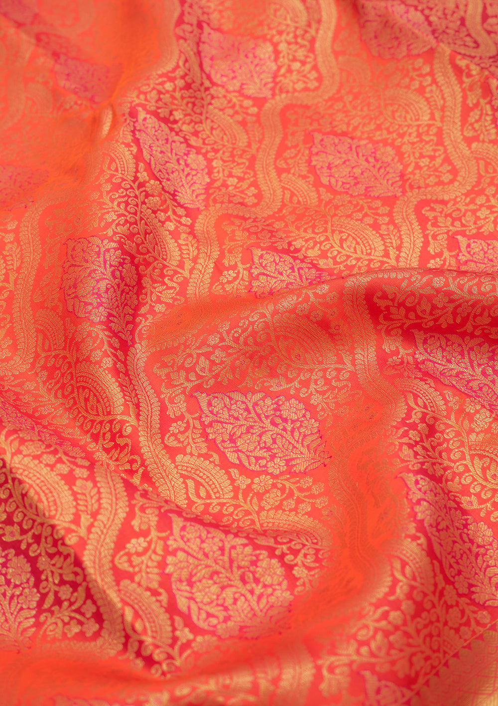 Orange Saree in Pure Silk fabric. The Saree is elevated with Zariwork embroidery. It comes with an Unstitched blouse. Comes with the Koskii promise of premium quality.