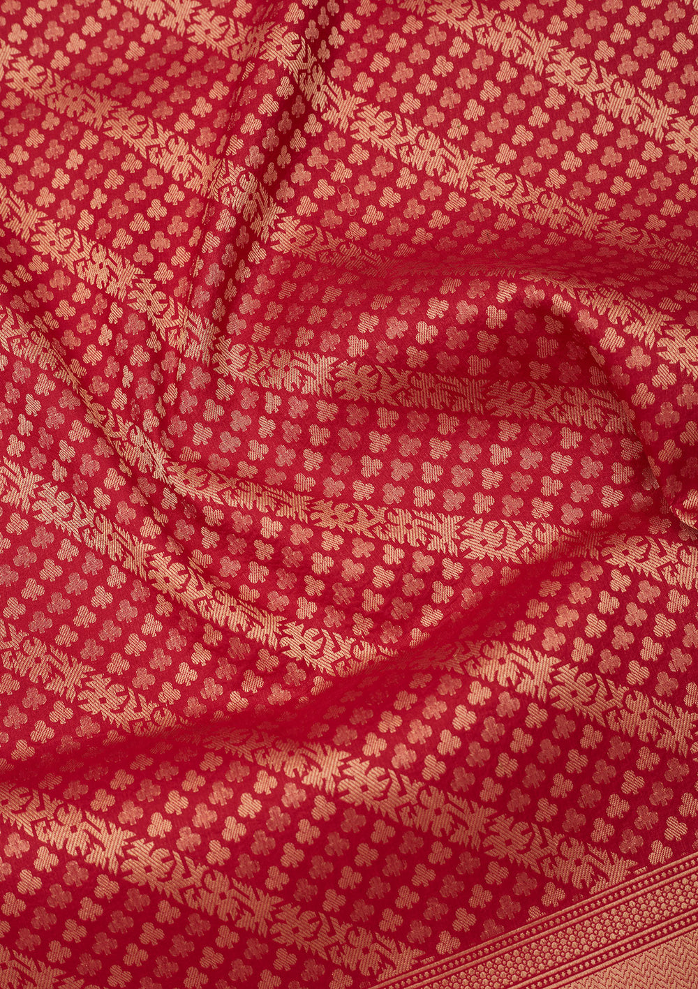 Red Saree in Pure Silk fabric. The Saree is elevated with Zariwork embroidery. It comes with an Unstitched blouse. Comes with the Koskii promise of premium quality.