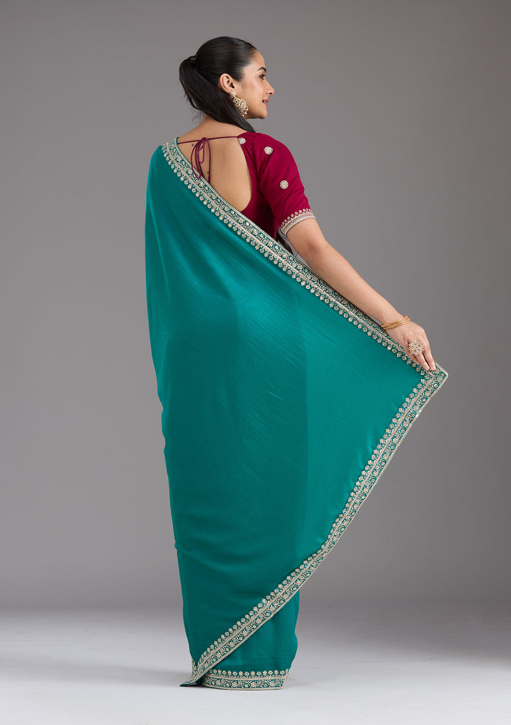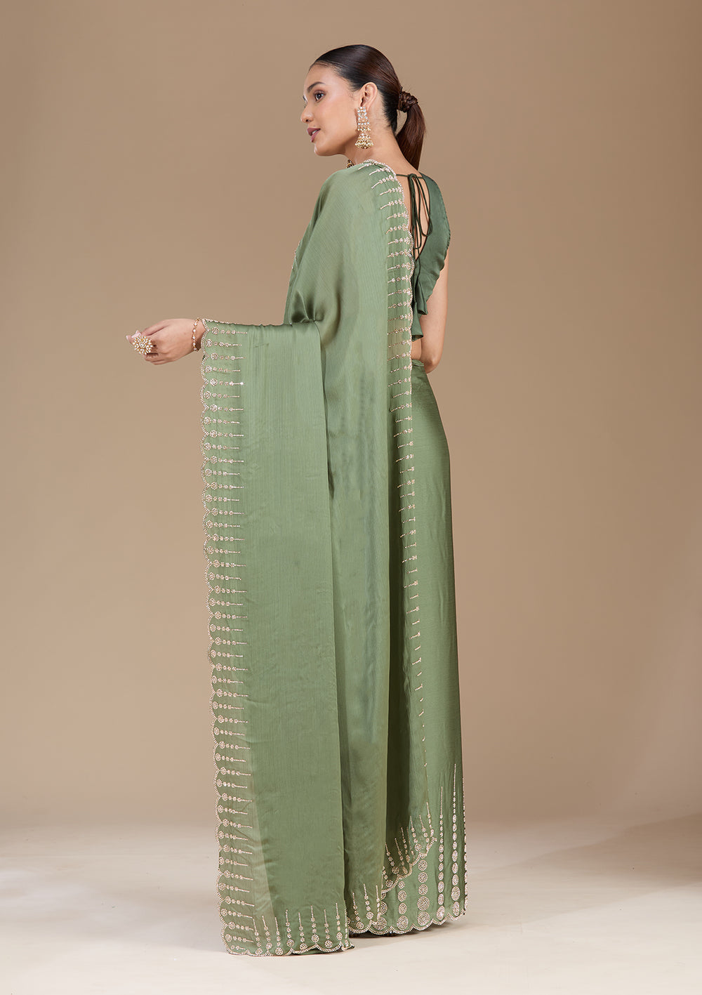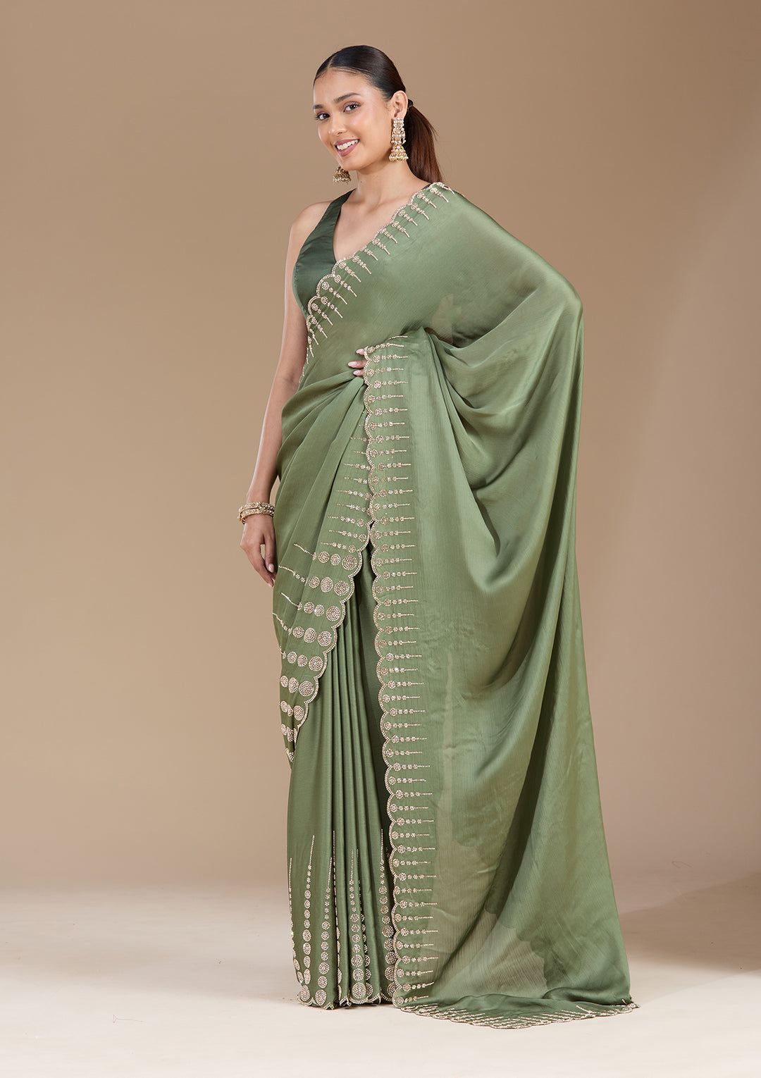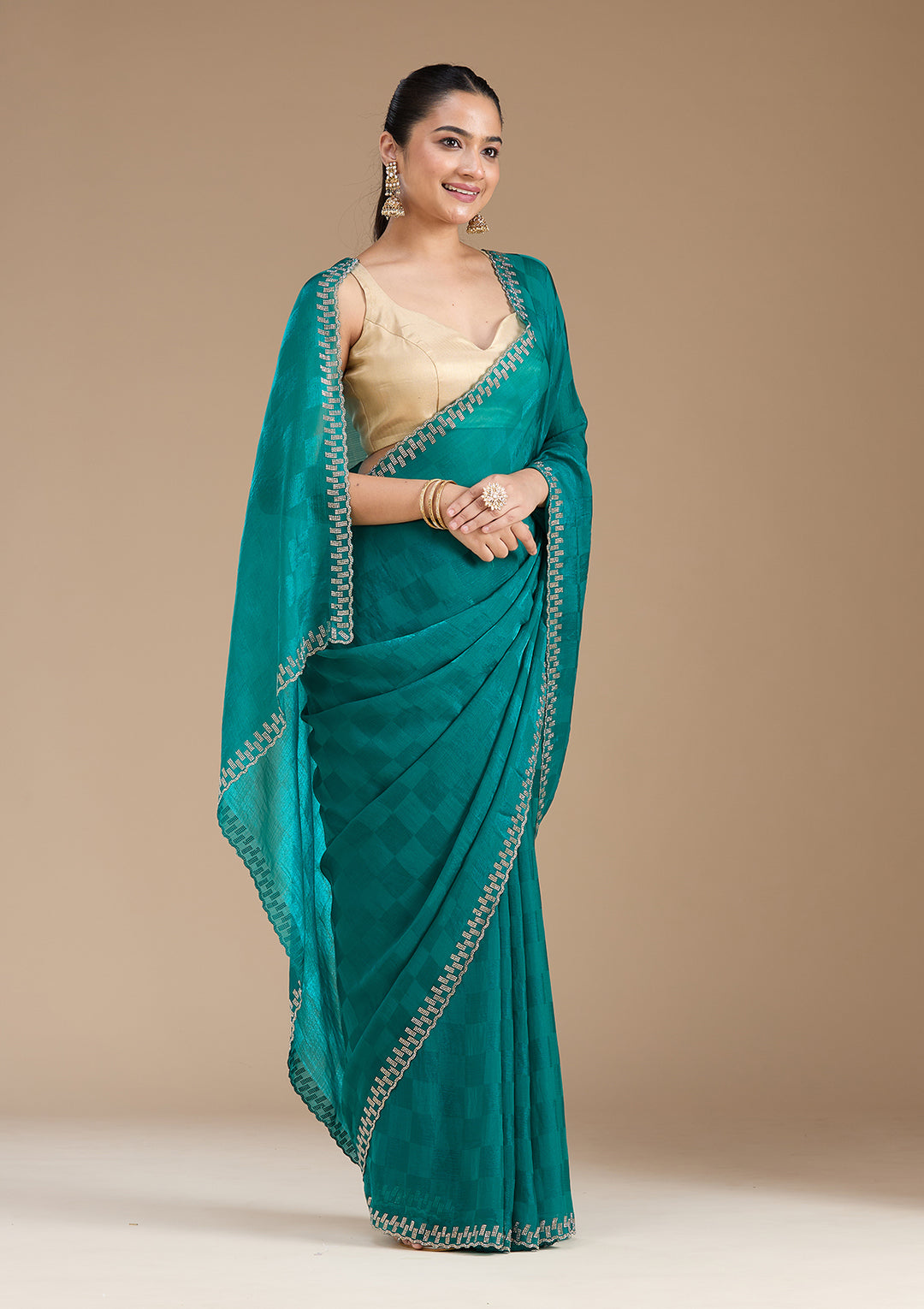The rich, earthy tones of mehendi green sarees are a stunning choice for the engagement event. A mehendi saree paired with an intricately designed blouse works beautifully in outdoor settings, where the natural surroundings complement the green hues of the saree.