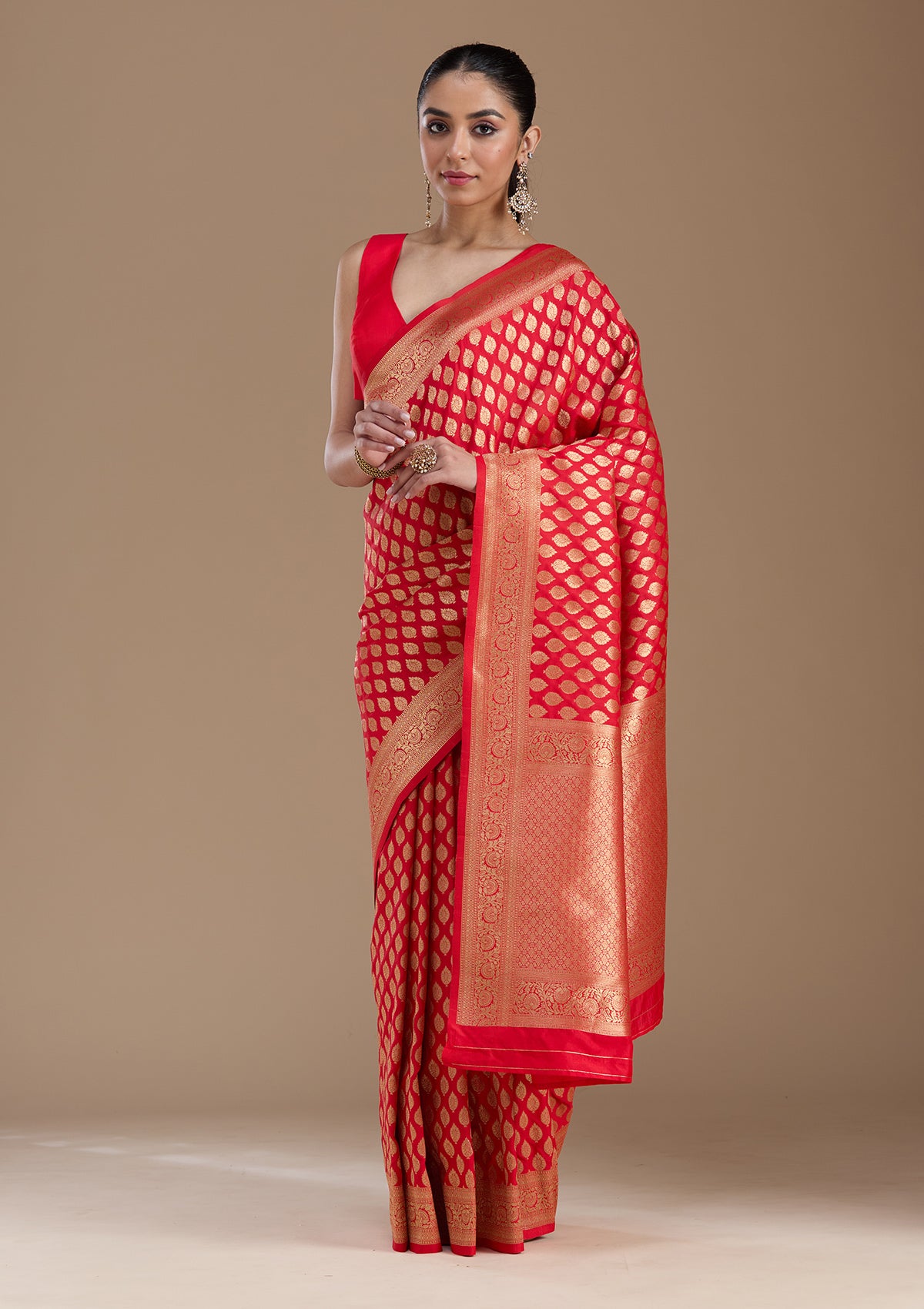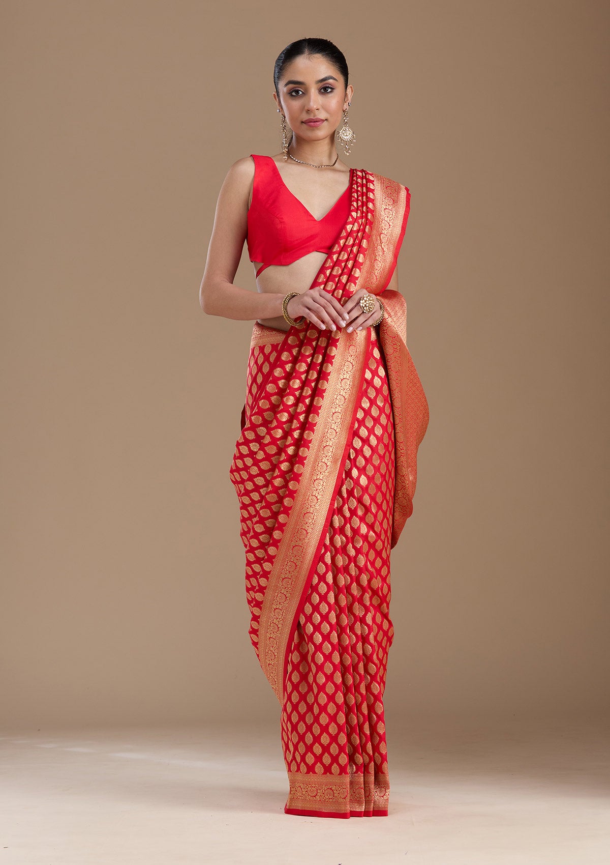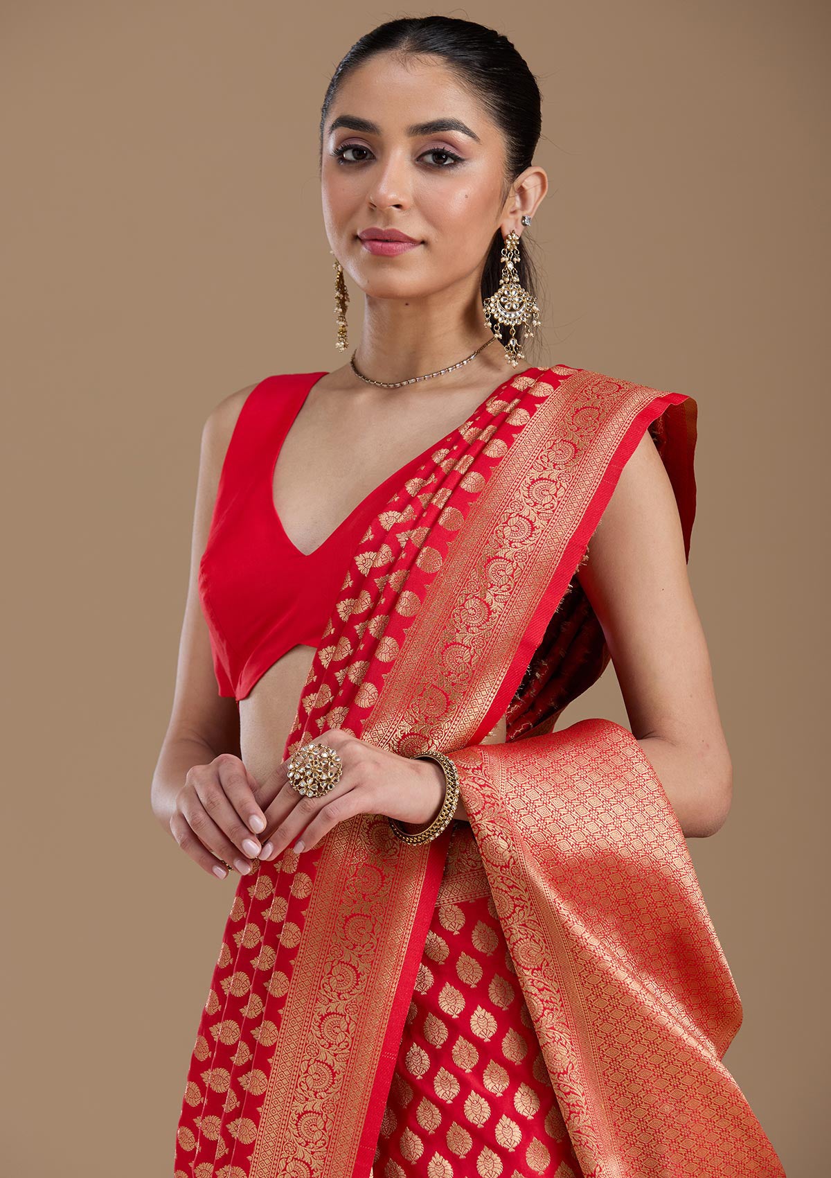 Red Silk_Saree in Art Silk fabric. The Silk_Saree is elevated with Zariwork embroidery. It comes with an Unstitched blouse. Comes with the Koskii promise of premium quality.