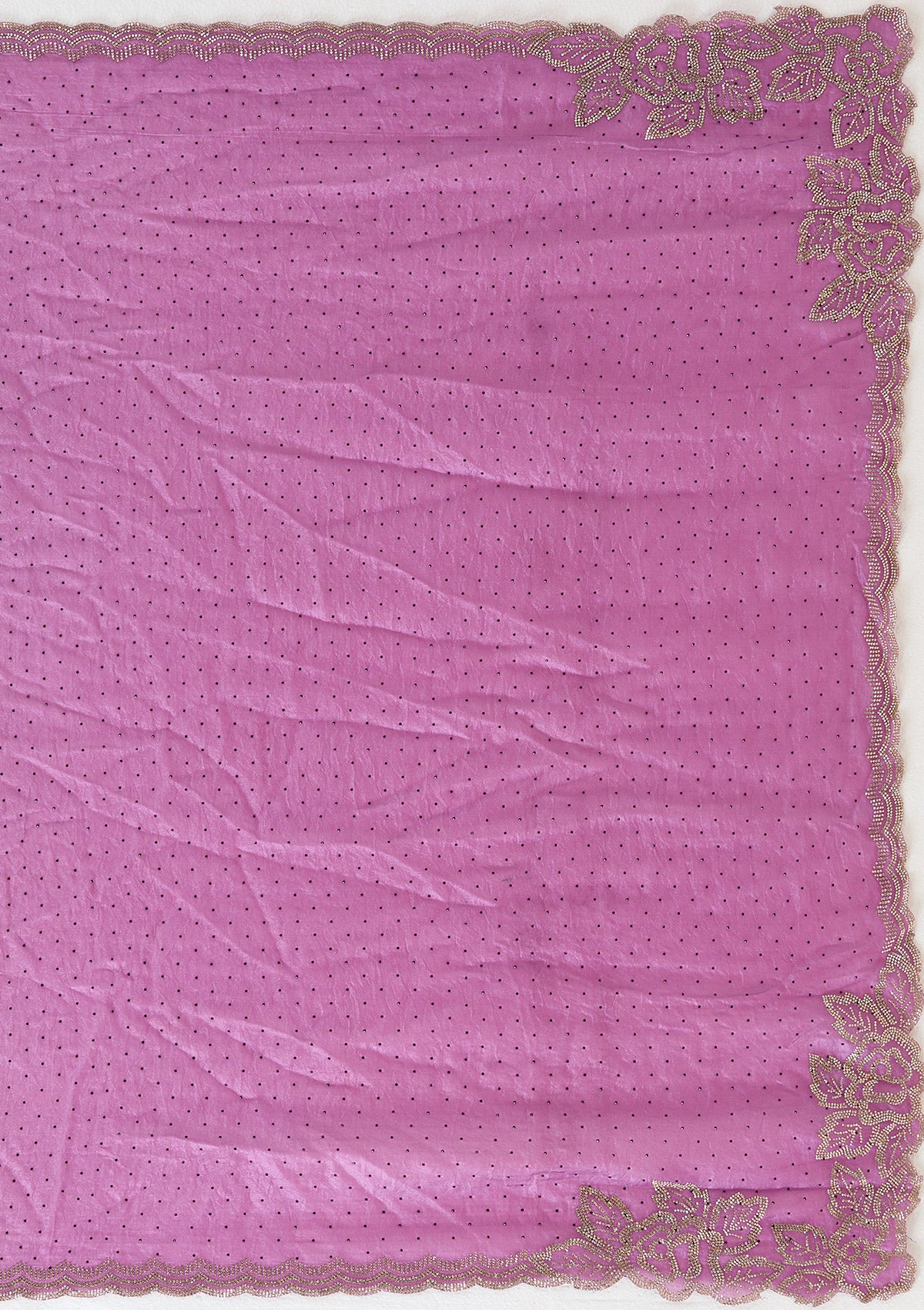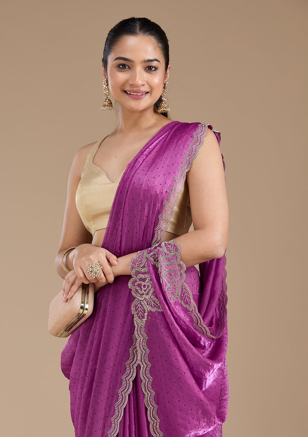 Wine Saree in Chiffon fabric. The Saree is elevated with Stonework (Gold) embroidery. It comes with an Unstitched blouse. Comes with the Koskii promise of premium quality.