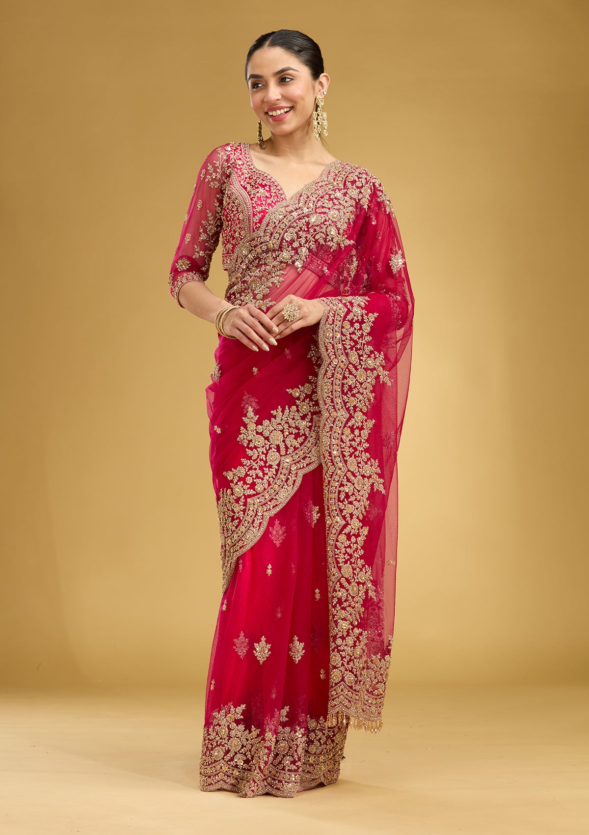 Rani Pink Saree in Net fabric. The Saree is elevated with Zariwork (Gold) embroidery. It comes with an Unstitched blouse. Comes with the Koskii promise of premium quality.