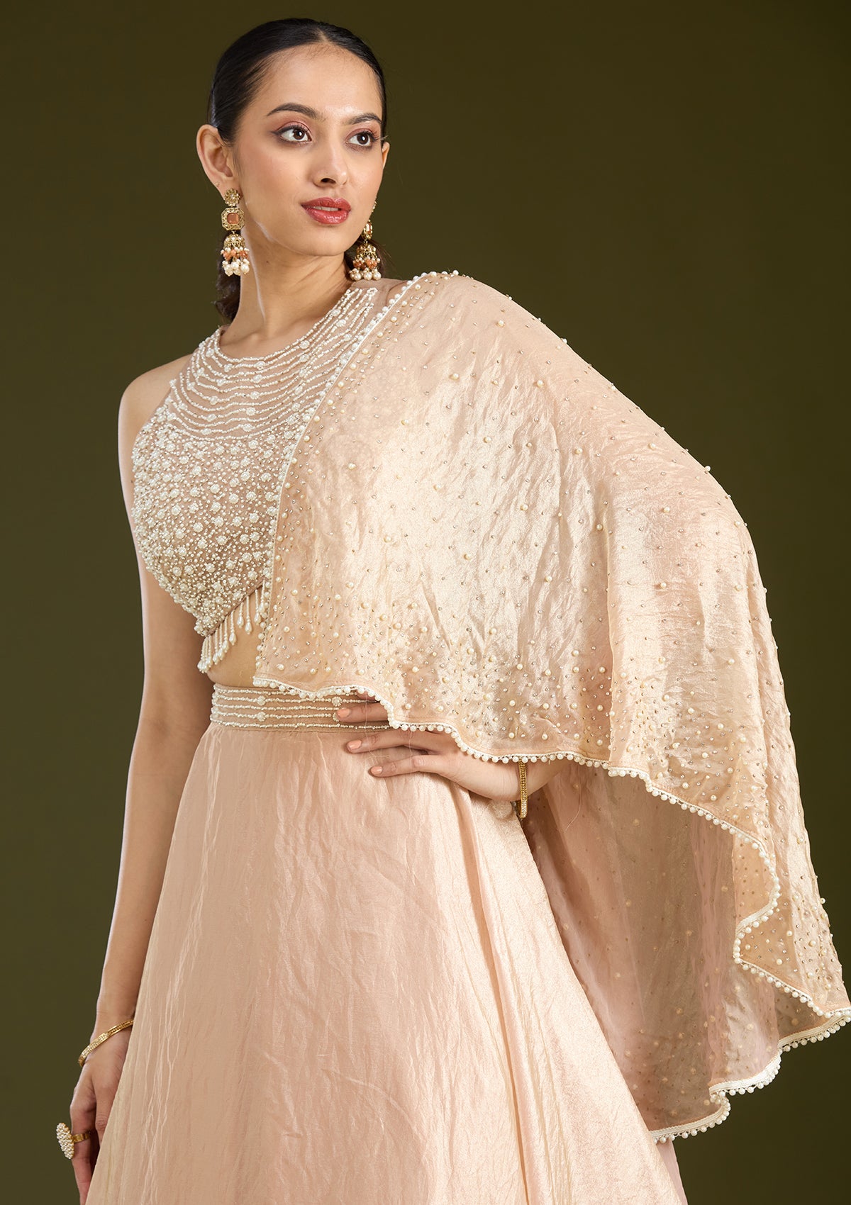 Beige Readymade Lehenga in Organza fabric. The Lehenga is embellished with Pearlwork embroidery. Accompanied with an Readymade blouse and dupatta. Comes with the Koskii promise of premium quality.