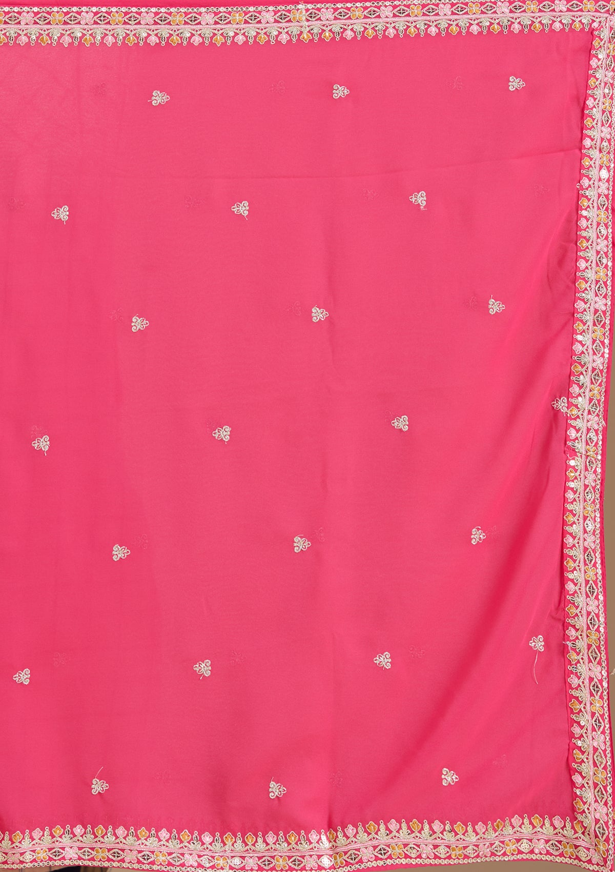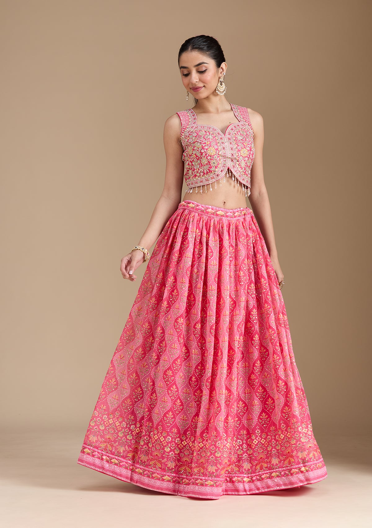 Pink Readymade Lehenga in Georgette fabric. The Lehenga is embellished with Zariwork (Gold) embroidery. Accompanied with an Readymade blouse and dupatta. Comes with the Koskii promise of premium quality.
