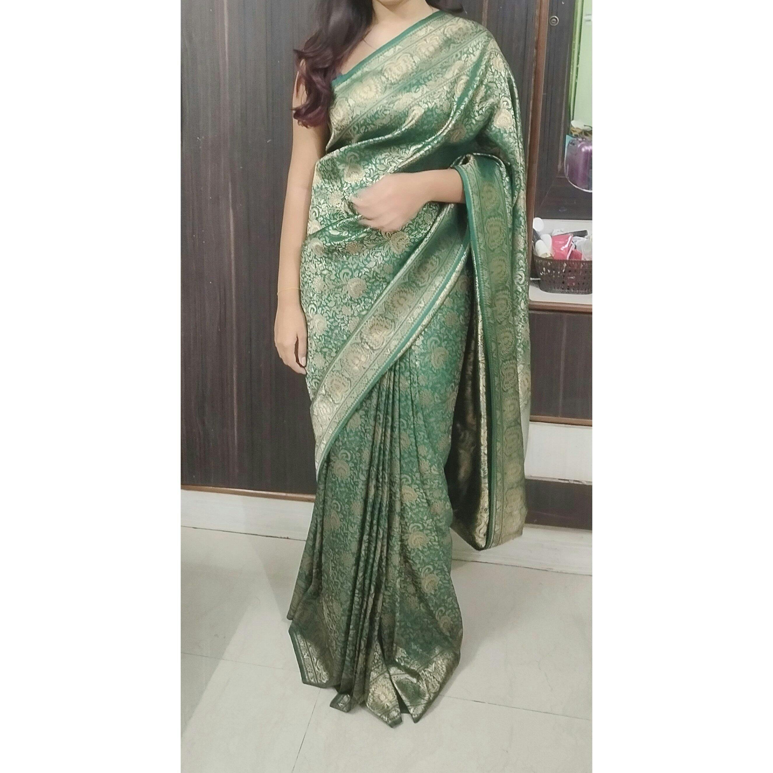 Bottle Green Saree in Silk fabric. The Silk_Saree is elevated with Banarasi embroidery. It comes with an Unstitched blouse. Comes with the Koskii promise of premium quality.