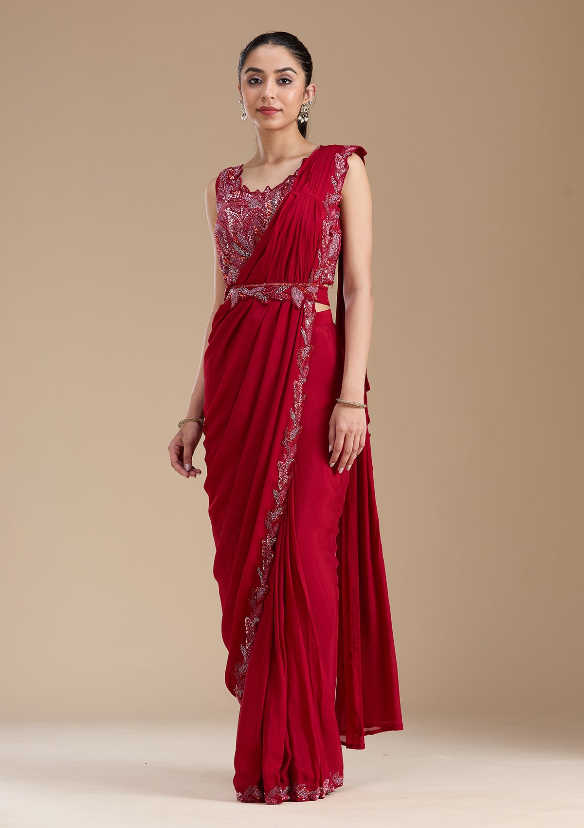 Maroon Saree in Satin fabric. The Saree is elevated with Sequins embroidery. It comes with an Unstitched blouse. Comes with the Koskii promise of premium quality.
