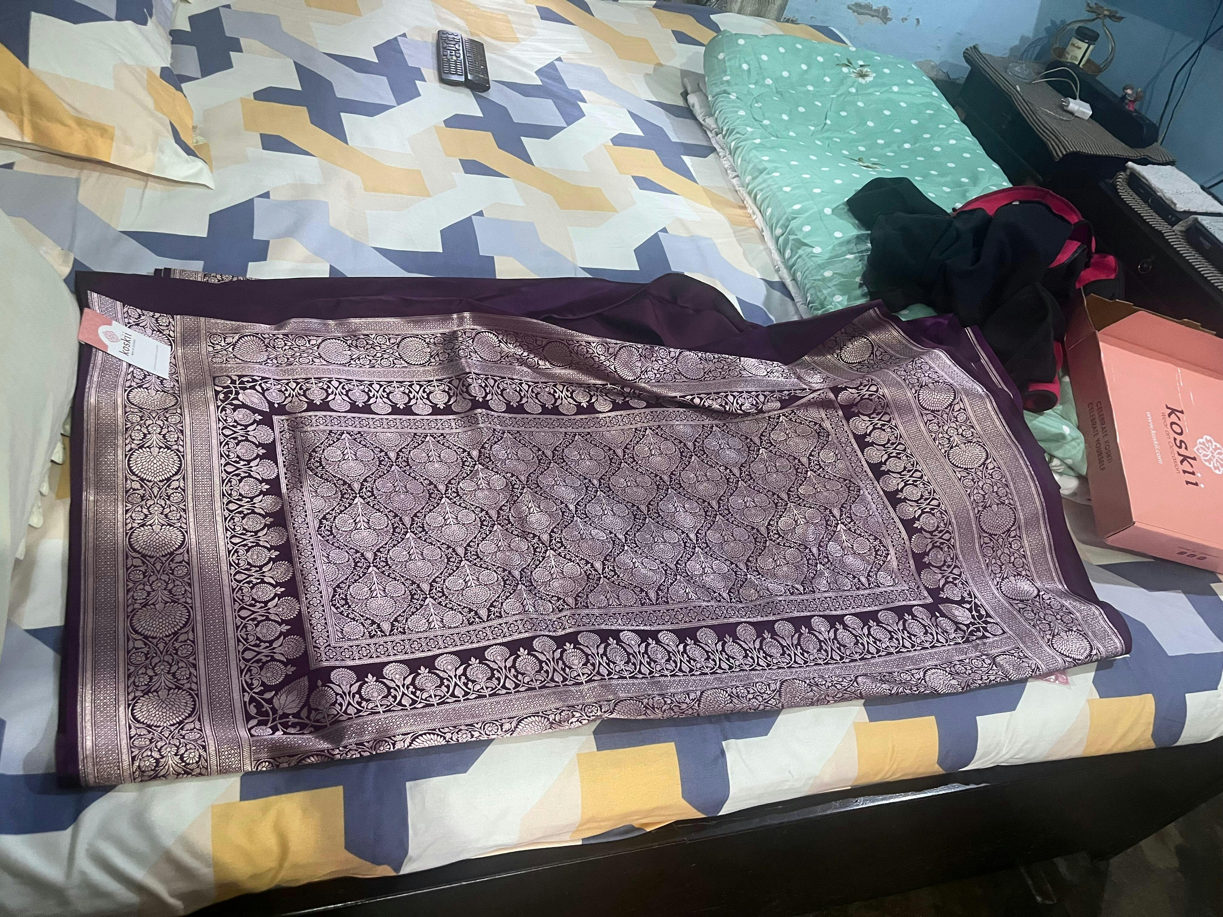 Purple Silk Saree in Satin fabric. The Silk Saree is elevated with Zariwork (Gold) embroidery. It comes with an Unstitched blouse. Comes with the Koskii promise of premium quality.