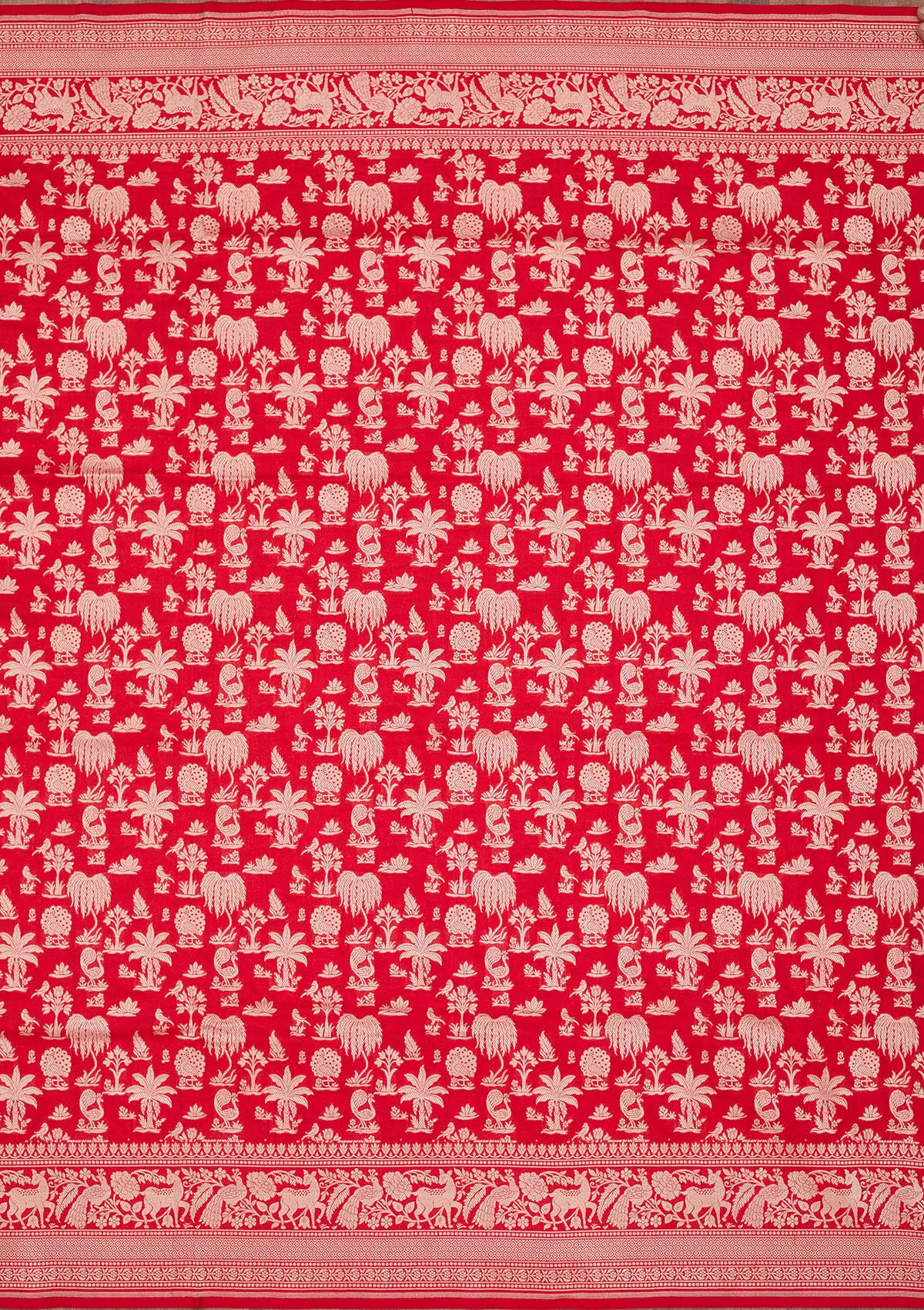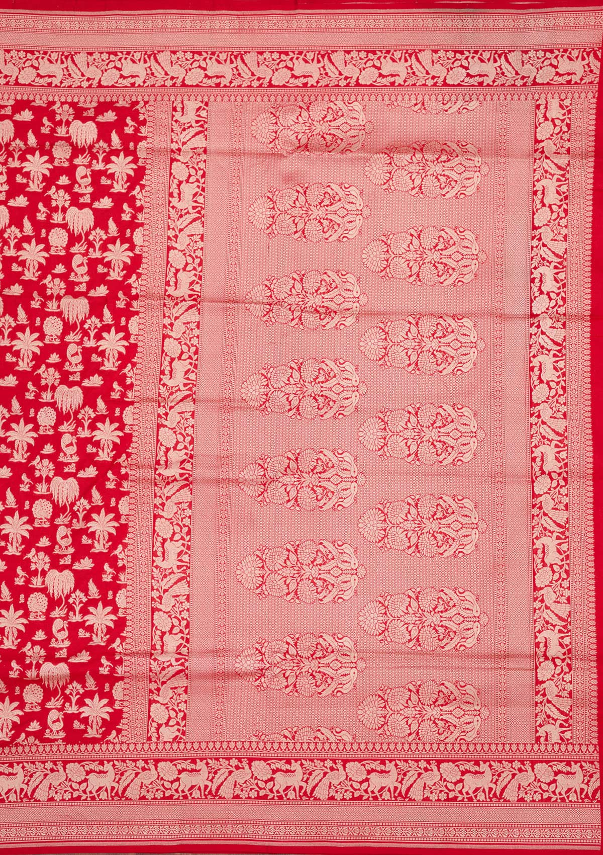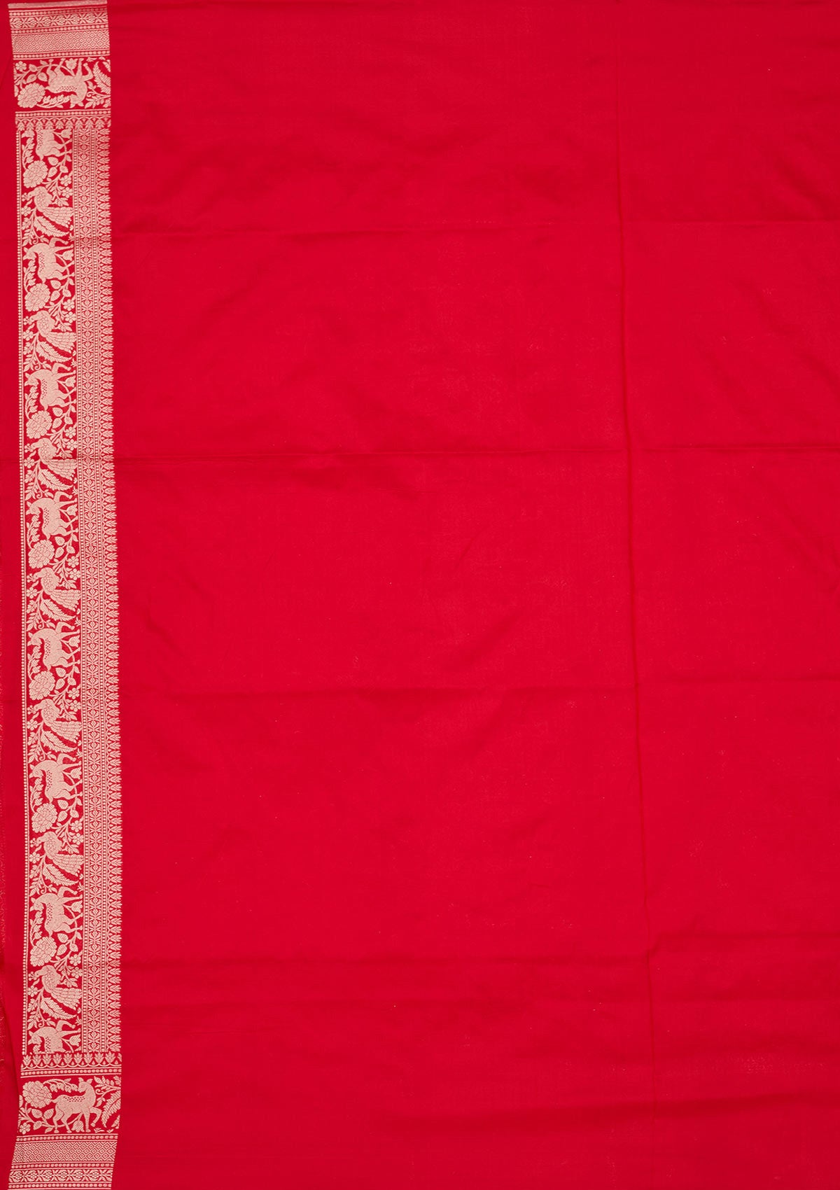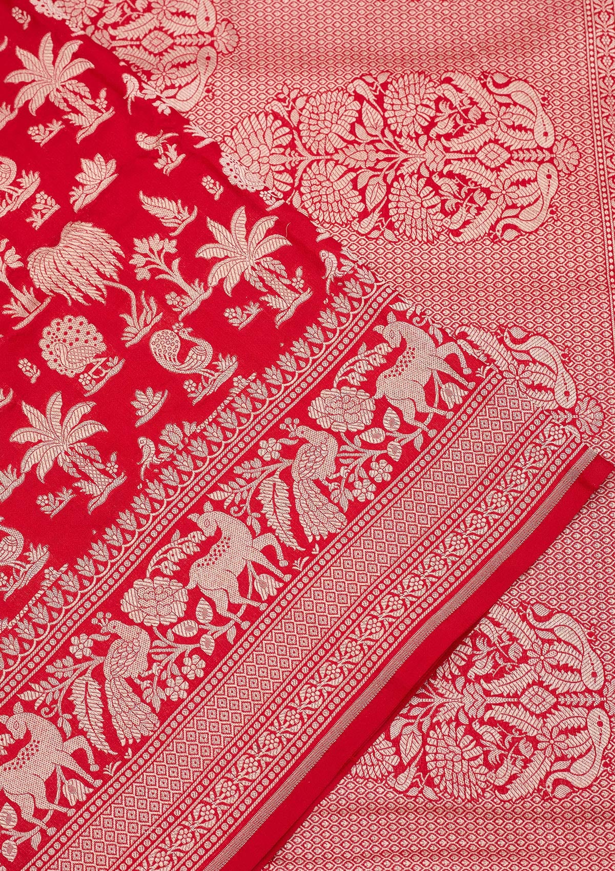 Red Silk Saree in Pure Silk fabric. The Silk Saree is elevated with Zariwork embroidery. It comes with an Unstitched blouse. Comes with the Koskii promise of premium quality.