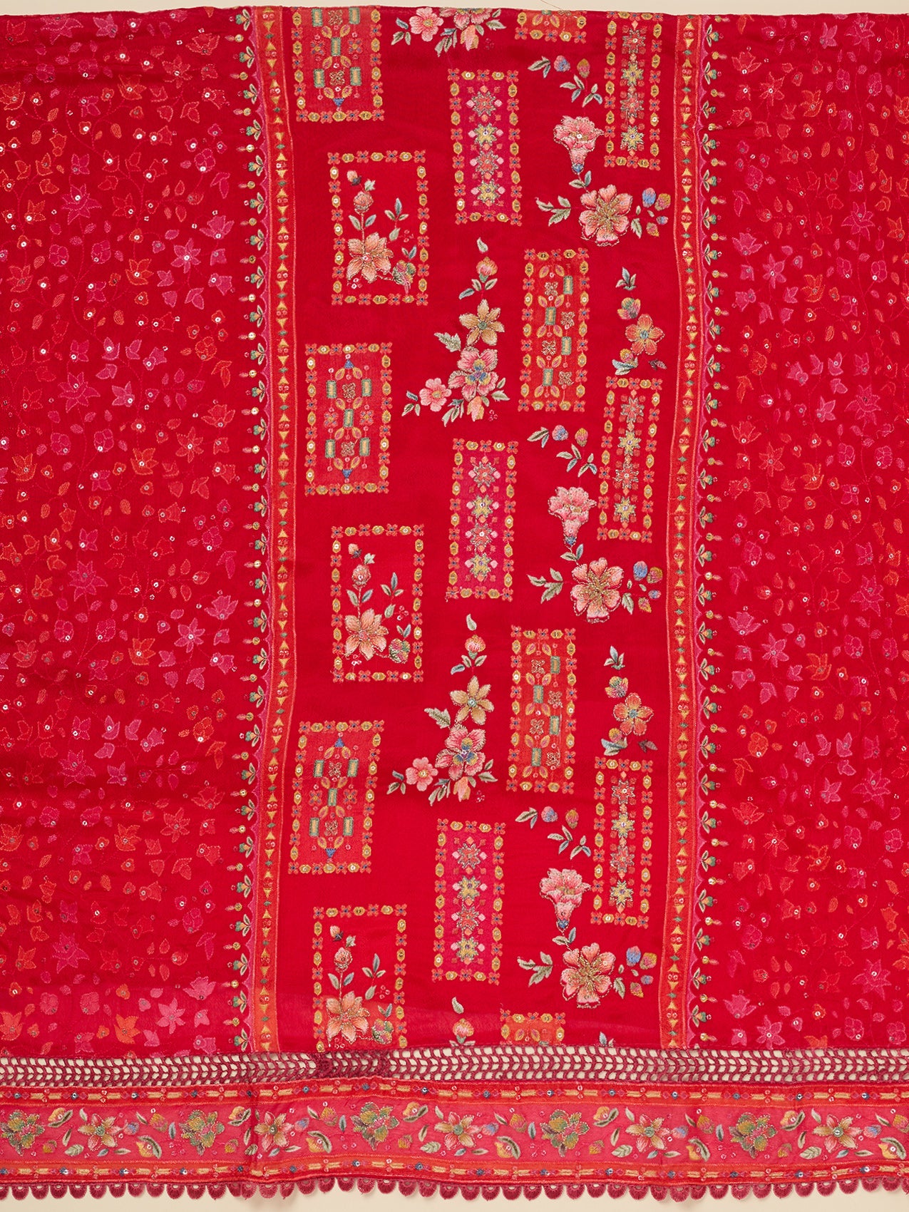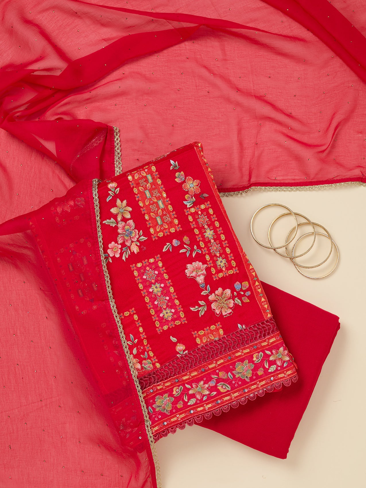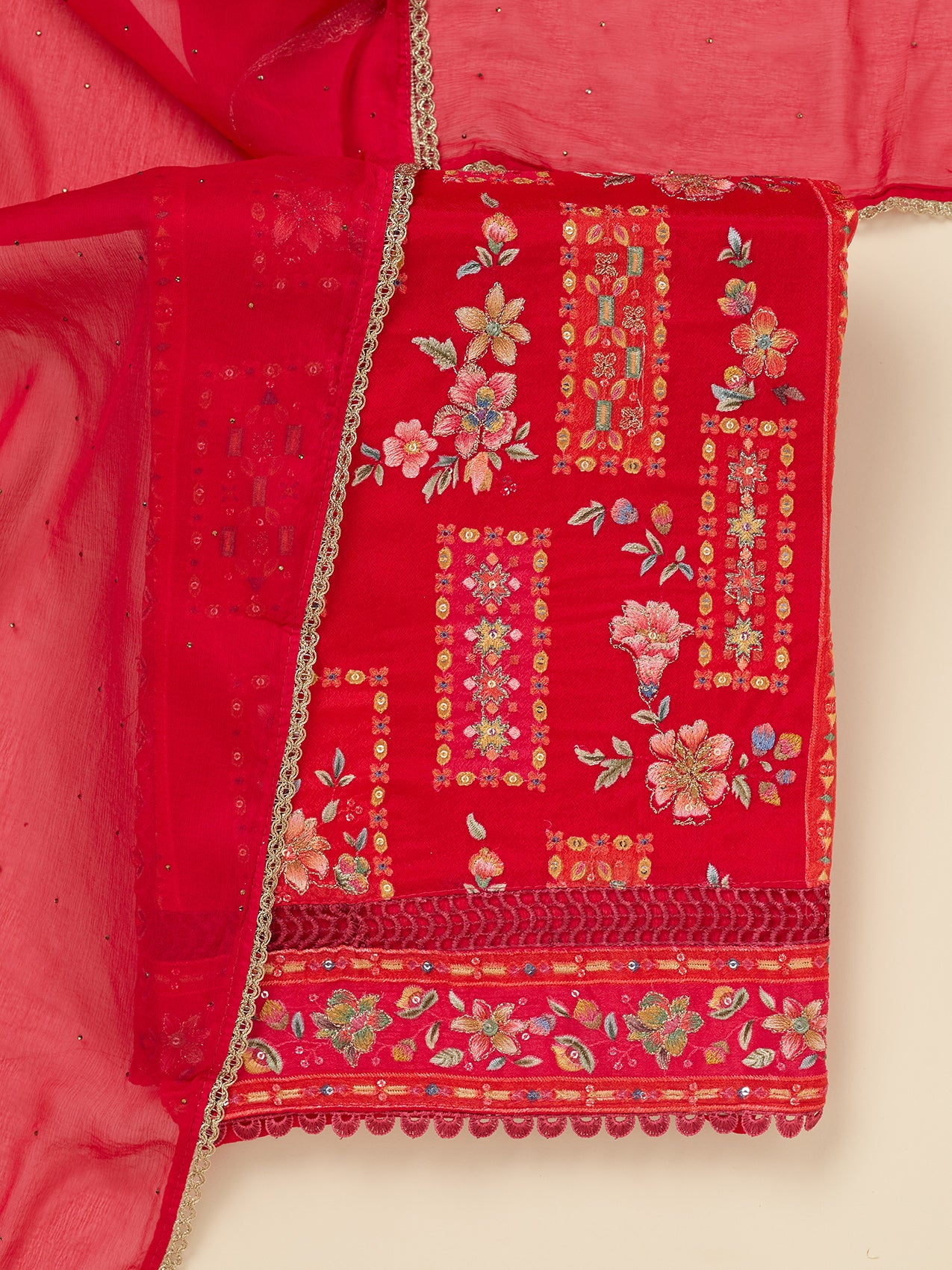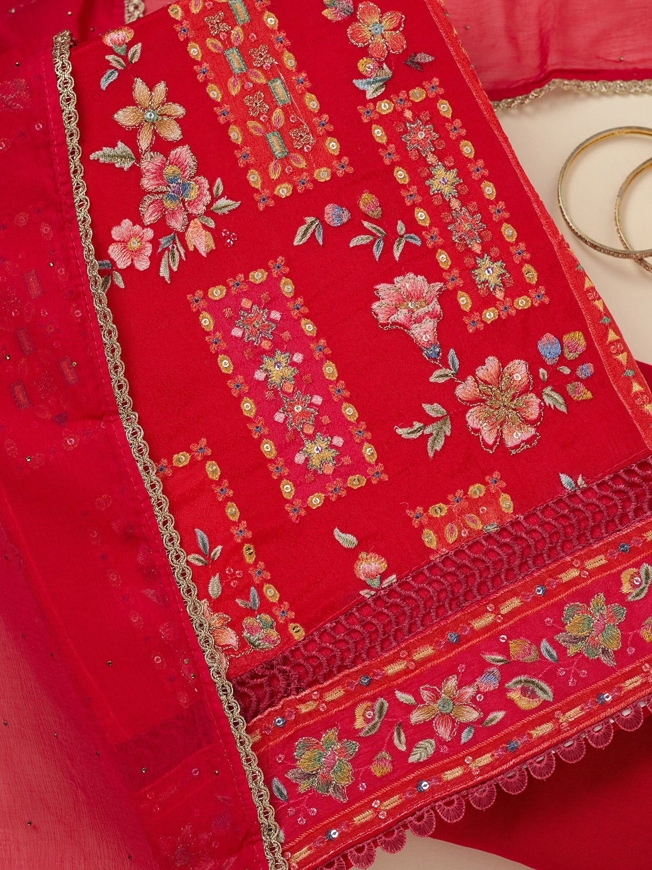 Red Salwar Suit in Georgette fabric. The Salwar Suit is embellished with Threadwork embroidery. Accompanied with a bottom and dupatta. Comes with the Koskii promise of premium quality.